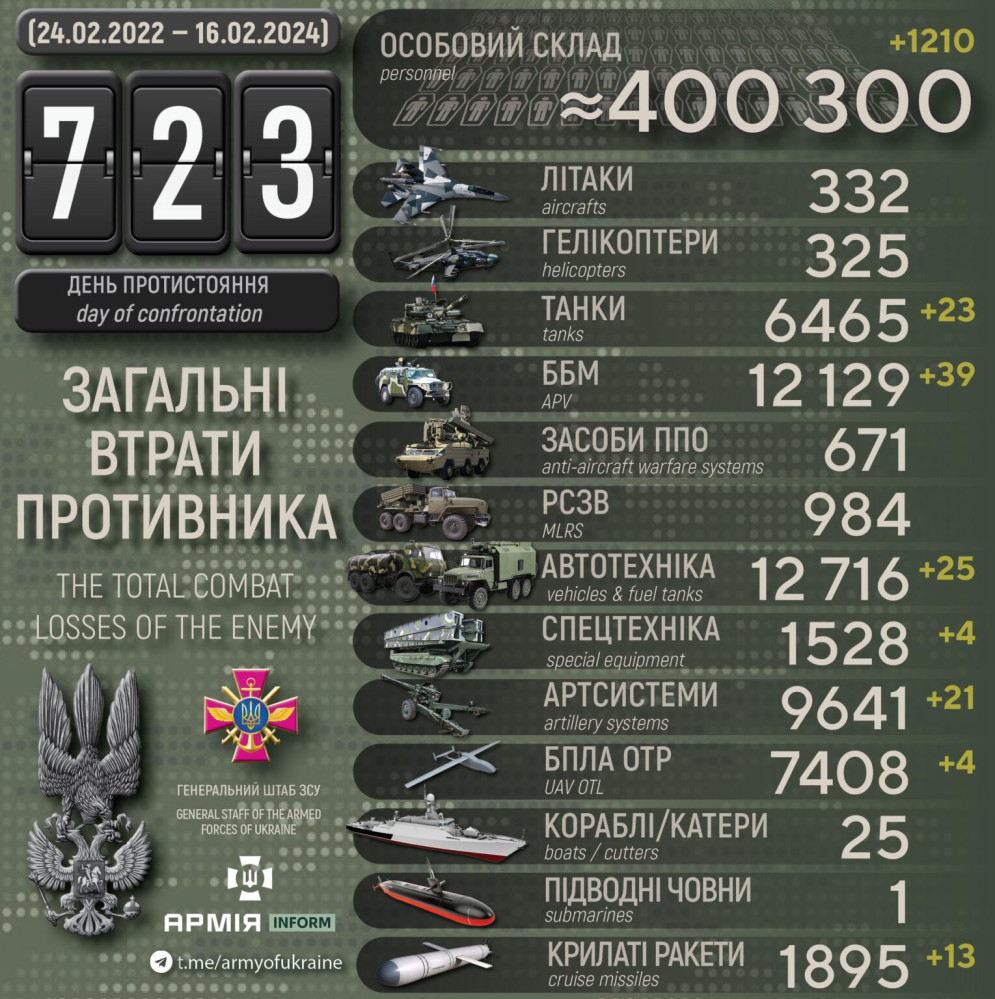 1210 осіб, 23 танки та 13 крилатих ракет втратили російські окупанти минулої доби. Крім того, за даними Генерального штабу Збройних сил України, наші захисники також знищили 21 артсистему, 39 бойових броньованих машин, чотири безпілотника, 25 одиниць автомобільної техніки та чотири одиниці спецтехніки. Усього з початку повномасштабного вторгнення втрати ворога склали: особового складу — 400 300 осіб; танків ‒ 6465 одиниць; бойових броньованих машин ‒ 12129 одиниць; артилерійських систем – 9641 одиницю; РСЗВ – 984 одиниці; засоби ППО ‒ 671 одиницю; літаків – 332 одиниці; гелікоптерів – 325 одиниць; БПЛА оперативно-тактичного рівня – 7408; крилаті ракети ‒ 1895; кораблі /катери ‒ 25 одиниць; підводні човни — 1 одиницю; автомобільної техніки та автоцистерн – 12716 одиниць; спеціальна техніка ‒ 1528. СМЕРТЬ РОСІЙСЬКИМ ОКУПАНТАМ! Помітили помилку? Виділяйте слова з помилкою та натискайте control-enter |