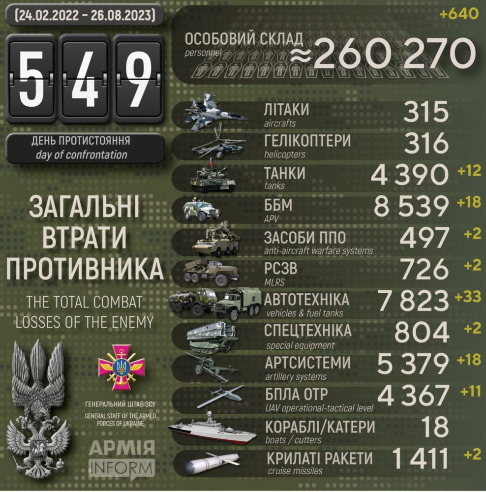 Втрати окупантів у війні з Україною перевищили 260 тисяч осіб: за добу знищено 640 загарбників і 12 танків640 осіб, дві крилаті ракети і 12 танків втратили окупанти в Україні за минулу добу. Крім того, за даними Генерального штабу Збройних сил України, наші захисники також знищили 18 артсистем, 18 бойових броньованих машин, дві РСЗВ, два засоби ППО, 11 БПЛА оперативно-тактичного рівня, 33 одиниці автомобільної техніки і дві одиниці спецтехніки. Усього з початку повномасштабного вторгнення втрати ворога склали: особового складу — 260 270 осіб; танків ‒ 4390 одиниць; бойових броньованих машин ‒ 8539 одиниць; артилерійських систем – 5379 одиниць; РСЗВ – 726 одиниць; засоби ППО ‒ 497 одиниць; літаків – 315 одиниць; гелікоптерів – 316 одиниць; БПЛА оперативно-тактичного рівня – 4367; крилаті ракети ‒ 1411; кораблі /катери ‒ 18 одиниць; автомобільної техніки та автоцистерн – 7823 одиниці; спеціальна техніка ‒ 804. СМЕРТЬ РОСІЙСЬКИМ ОКУПАНТАМ! Помітили помилку? Виділяйте слова з помилкою та натискайте control-enter |