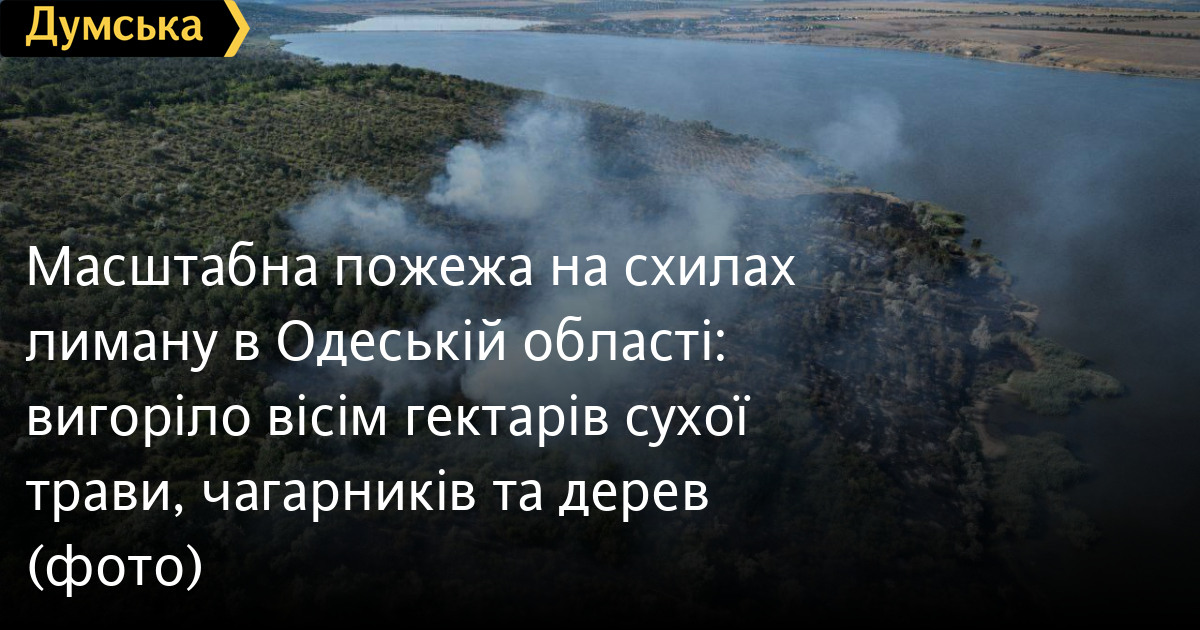 Масштабна пожежа на схилах лиману в Одеській області: вигоріло вісім гектарів сухої трави, чагарників та деревМасштабну пожежу на схилах лиману в околицях села Паліївка Одеського району загасили рятувальники сьогодні вдень. Як повідомили в обласному управлінні ДСНС, виклик надійшов о 13:37. До прибуття рятувальників вогонь поширився на вісім гектарів, знищивши суху траву, чагарники та дерева. Особливості рельєфу (крутий схил, яри) суттєво ускладнили роботу рятувальників. О 19:05 пожежу було ліквідовано. Ймовірна причина загоряння — необережне поводження з вогнем невстановленою особою. На місці працювали 31 рятувальник і сім одиниць спецтехніки, а також 12 осіб і два трактори від громади та лісництва. Помітили помилку? Виділяйте слова з помилкою та натискайте control-enter Новини по цій темі: 9 жовтня 2025: Нічний удар по Одеській області: постраждали п'ятеро людей, понад 30 тисяч абонентів залишилися без світла 19 серпня 2025: У будівлі коледжу в центрі Одеси виявили труп невідомого 10 червня 2025: Масштабна пожежа у центрі Одеси: ймовірні винуватці спустилися по дереву з третього поверху та намагалися втекти (фото, відео, оновлено) 10 червня 2025: Одесу атакують дрони: дісталося пологовому та житловим будинкам і станції швидкої допомоги (оновлюється, фото) |