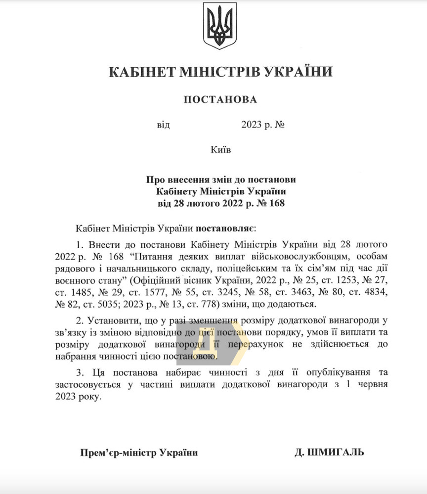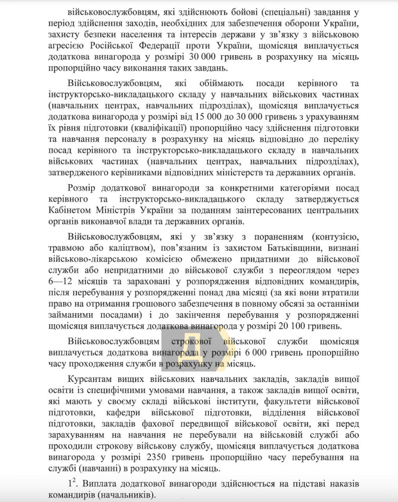 Кабмін розблокував виплати строковикам, Нацгвардії та прикордонникам (документ)Постанову про порядок виплат військовослужбовцям ухвалив Кабінет міністрів України на позачерговому засіданні 9 серпня. Це сталося після того, як нардеп Олексій Гончаренко заявив, що вимагатиме відставки уряду і блокуватиме всі законопроєкти. Тепер курсанти, строковики, обмежено придатні, виведені за штат, інструктори навчальних центрів зможуть отримати відповідні доплати, гарантовані законом, ухвалення якого домігся народний обранець. Важливо, що виплати прийдуть одразу за червень і липень. Також повертають бойові виплати для Державної прикордонної служби та Нацгвардії, тож у серпні вони отримають бойові доплати одразу за ті самі два місяці. «Тобто закон був, виплати мали бути, але без відповідних роз'яснень уряду воно не могло запрацювати. Тепер, нарешті, все ухвалено», — написав нардеп. Закон про додаткові доплати військовослужбовцям було ухвалено наприкінці червня цього року Верховною Радою. Зазначимо, що на час дії воєнного стану розмір доплат становитиме від 30 тисяч до 100 тисяч гривень щомісяця для військовослужбовців, які виконують бойові (спеціальні) завдання. 20 100 гривень платитимуть військовим, які у зв'язку з пораненням визнані обмежено придатними та зараховані в розпорядження відповідного командира. Строковикам — 6000 гривень, а курсантам — 2350. Інструкторам у військових частинах платитимуть від 15 000 до 30 000 гривень. СМЕРТЬ РОСІЙСЬКИМ ОКУПАНТАМ! Помітили помилку? Виділяйте слова з помилкою та натискайте control-enter |
