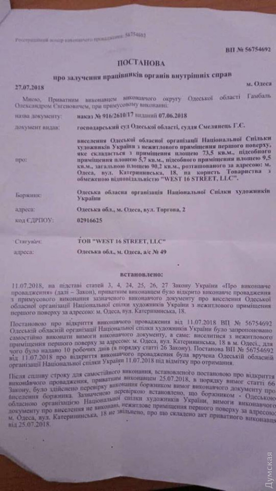 Галерею Одесского отделения Национального союза художников буквально выкинули из помещения в доме №18 на Екатерининской улице, которое она занимала больше 70 лет. Сегодня днем туда пришли люди, которые назвались правоохранителями и заставили художников немедленно подчиниться решению суда и освободить помещение, передает корреспондент «Думской». Советник начальника ГУНП в Одесской области Руслан Форостяк, комментируя произошедшее, заявил, что все действия были проведены в соответствии с законодательством. По его словам, 27 июля было получено постановление о привлечении правоохранителей к принудительному исполнению судебного решения. «Мне может нравиться судебное решение или нет, но я сторонник верховенства права, поэтому, извините, когда есть исполнительное производство, судебный исполнитель и постановление о принудительном исполнении судебного решения, если мы строим устойчивое общество и правовое государство, то я лично буду это выполнять», — отметил Форостяк. Стоит отметить, что вели себя визитеры по-хамски и даже угрожали разбить камеру женщине, которая вела видеосъемку на месте событий. Напомним, конфликт из-за комнат, которые творческая организация занимает с 1947 года, продолжается уже больше десяти лет. В 2000 году мэрия официально закрепила их за Союзом, заключив с ним договор о бессрочном бесплатном пользовании (хотя могла и передать в собственность). В мае 2007-го собственником помещения стала фирма «Аркадия-2000» — по мировому соглашению с муниципалитетом. Она тут же перепродала его предприятию «Мерф». В салон заявились хмурые типы, попробовавшие выбросить оттуда творцов. Избили некоторых из них, похитили председателя организации, народного художника Украины Анатолия Горбенко. После вмешательства милиции и депутатов горсовета рейдеры покинули помещение и освободили пленника. Попытки захвата предпринимались еще несколько раз, но тоже безуспешно. В марте 2013 года «Мерф» продал спорное помещение американской компании WEST 16 STREET. LLC, которая сперва тоже попробовала выселить художников силой, а потом затеяла с ними долгую тяжбу. В прошлом году две инстанции подтвердили, что НСХУ занимает помещение законно: «Смена собственников спорного помещения не влияет на действие договора бессрочного бесплатного пользования нежилым помещением», — говорится в решении суда. WEST 16 STREET. LLC не сдалась и подала новый иск – о признании незаконным и расторжении упомянутого договора 2000 года. В феврале 2018 года этот иск был удовлетворен, а через некоторое время решение первой инстанции подтвердил апелляционный суд, решение которого и привели сегодня в действие исполнители. Одесская организация Национального союза художников обжаловала постановление в Верховном суде Украины. СМЕРТЬ РОСІЙСЬКИМ ОКУПАНТАМ! Помітили помилку? Виділяйте слова з помилкою та натискайте control-enter |