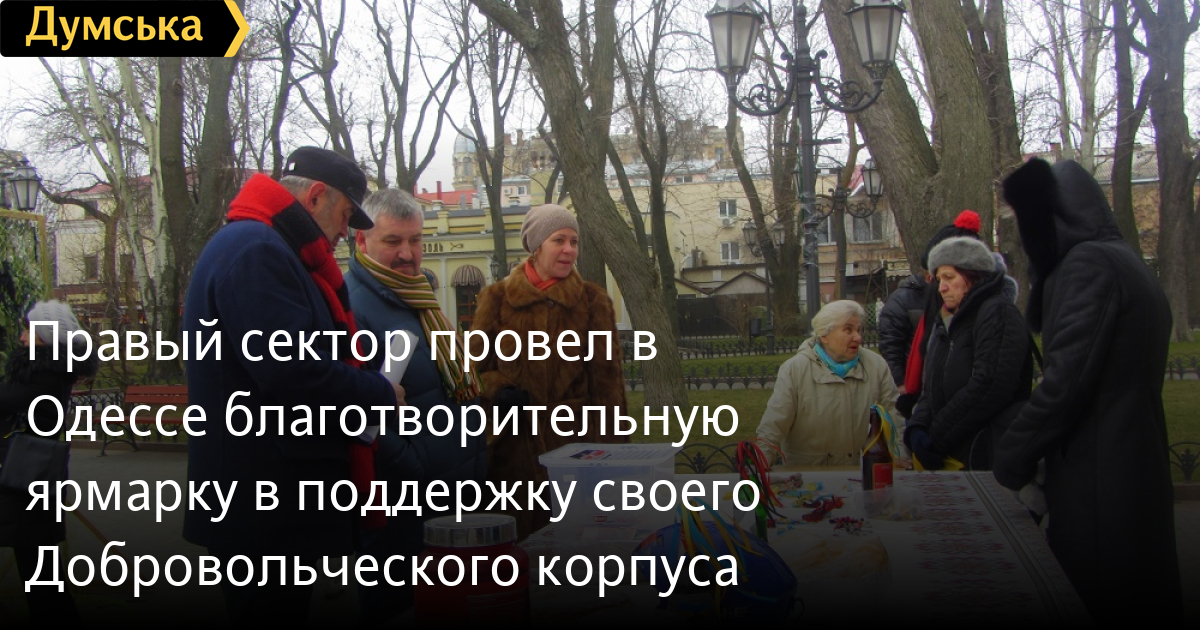 «Правый сектор» провел в Одессе благотворительную ярмарку в поддержку своего Добровольческого корпуса«Правый сектор» провел в одесском Горсаду благотворительную ярмарку в поддержку Добровольческого Украинского Корпуса. Акция состоялась в воскресенье. Все собранные деньги активисты ПС намерены потратить на приобретение необходимых вещей для бойцов, которые сейчас воюют на востоке. Ярмарка началась в 10:00 и продлилась до 17:00. Пожертвовать можно было любую сумму — на свое усмотрение. Угощали печеньем, пирогами, хлебом с салом и чесноком, чаем и кофе. Также на ярмарке можно было приобрести украшения с украинской символикой. Кроме того, посетителям предлагали сплести маскировочную сетку, которую также передадут бойцам на фронт. Автор — Кристина Немченко СМЕРТЬ РОСІЙСЬКИМ ОКУПАНТАМ! Помітили помилку? Виділяйте слова з помилкою та натискайте control-enter |