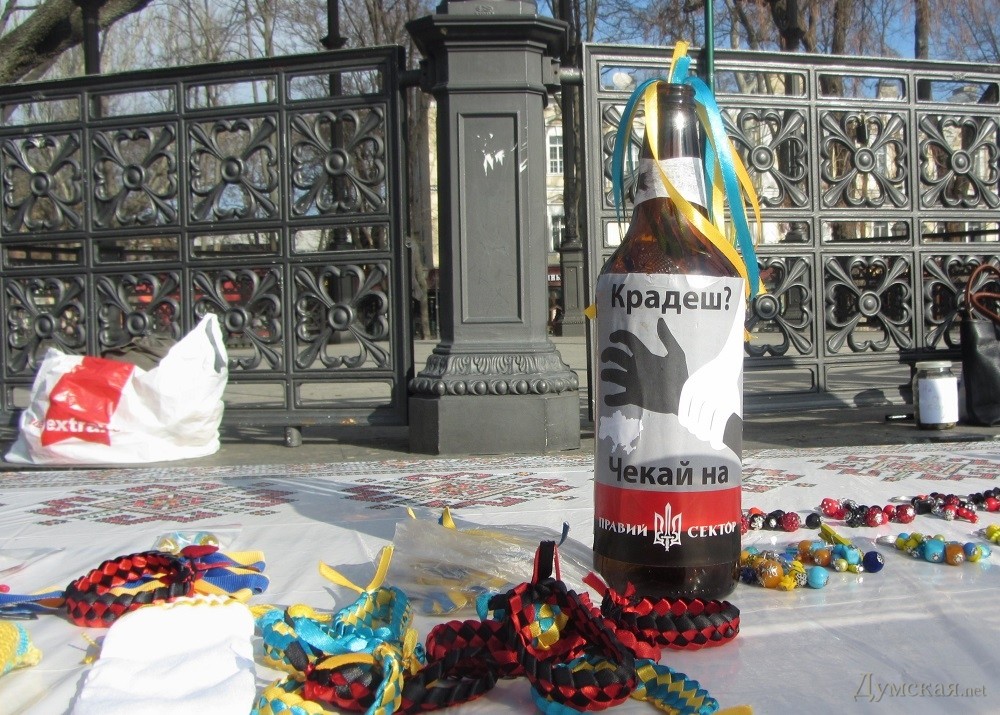 «Правый сектор» провел в Одессе благотворительную ярмарку в поддержку своего Добровольческого корпуса«Правый сектор» провел в одесском Горсаду благотворительную ярмарку в поддержку Добровольческого Украинского Корпуса. Акция состоялась в воскресенье. Все собранные деньги активисты ПС намерены потратить на приобретение необходимых вещей для бойцов, которые сейчас воюют на востоке. Ярмарка началась в 10:00 и продлилась до 17:00. Пожертвовать можно было любую сумму — на свое усмотрение. Угощали печеньем, пирогами, хлебом с салом и чесноком, чаем и кофе. Также на ярмарке можно было приобрести украшения с украинской символикой. Кроме того, посетителям предлагали сплести маскировочную сетку, которую также передадут бойцам на фронт. Автор — Кристина Немченко СМЕРТЬ РОСІЙСЬКИМ ОКУПАНТАМ! Помітили помилку? Виділяйте слова з помилкою та натискайте control-enter |