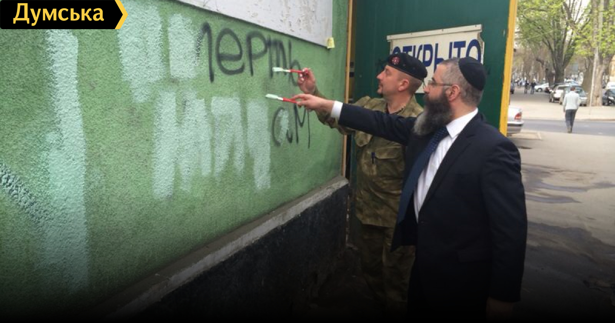 Часть свастик и надписей «Смерть жидам» закрасили лично главный раввин Одессы и Юга Украины Авраам Вольф и командир УНСО Валерий Загородний.