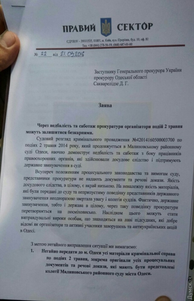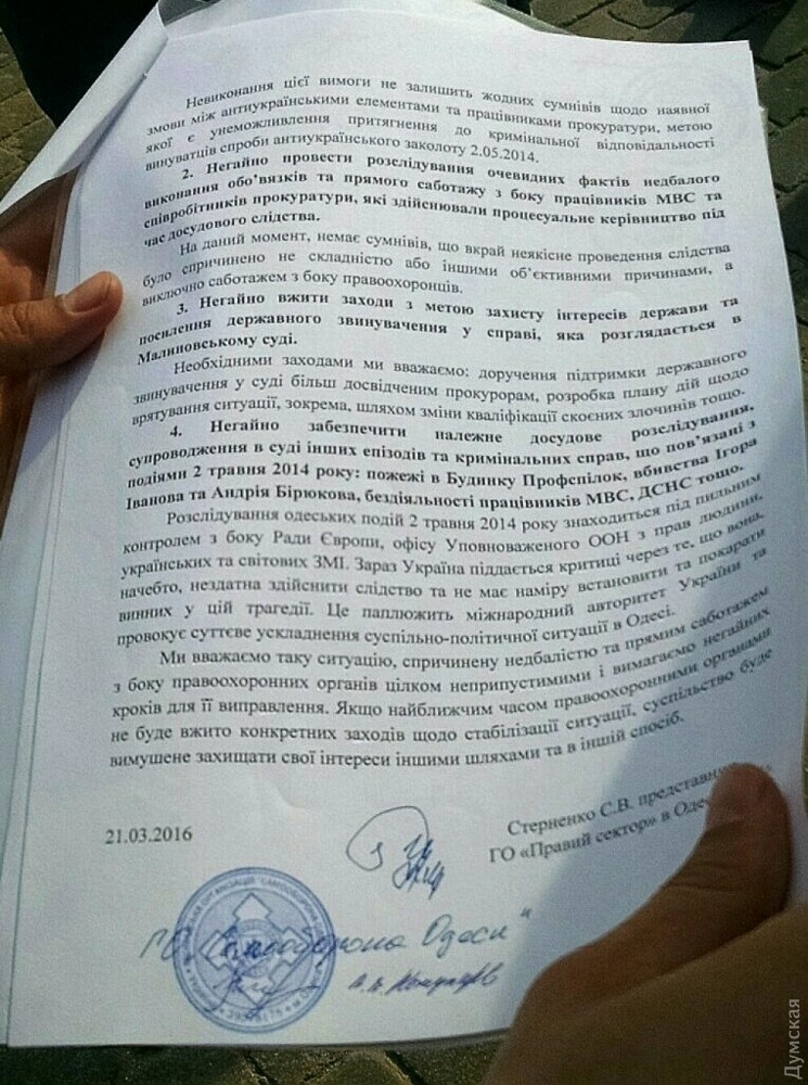 По словам инициатора пикета Сергея Стерненко, возмущение вызывает тот факт, что государственное обвинение не может предъявить доказательства вины ключевых участников событий: оригиналы документов и вещественные доказательства находятся в Киеве, и несмотря на многочисленные требования суда, в Одессу их не передают. Это может привести к оправданию подсудимых, и первый звоночек уже прозвучал — суд не стал продлевать на два месяца срок содержания под стражей для россиянина Евгения Мефедова, в отношении которого не были представлены доказательства, и в скором времени он может выйти на свободу. «Правый сектор» расценивает это как сговор и сформулировал четыре основных требований к Генеральной прокуратуре: — немедленно передать в Одессу все материалы уголовного дела, иначе бездействие прокуроров будет однозначно трактоваться как сговор с целью развала дела; — немедленно провести расследование очевидных фактов халатности и прямого саботажа со стороны сотрудников МВД и прокуратуры, которые проводили расследование; — немедленно принять меры для усиления государственного обвинения в деле — в частности, назначить более опытных прокуроров и рассмотреть вопрос об изменении квалификации (сейчас абсолютно всех фигурантов дела обвиняют в организации и участии в массовых беспорядков с тяжкими последствиями); — немедленно обеспечить надлежащее расследование других эпизодов, в частности, пожара в Доме профсоюзов, убийства Игоря Иванова и Андрея Бирюкова, бездействия работников ГСЧС и МВД, в том числе 4 мая 2014 года. К обращению «Правого сектора» присоединились и другие проукраинские организации, в том числе «Самооборона» и «Автомайдан». «Патриотические организации не допустят вынесения оправдательных приговоров, организаторы трагедии не будут ходить по одесским улицам», — заявил глава «Совета общественной безопасности» Марк Гордиенко. По его мнению, выходом из ситуации мог бы стать обмен фигурантов на украинских военных, которые находятся в плену у сепаратистов. Перечисленные в письме требования касаются в первую очередь Генеральной прокуратуры. По словам Стерненко, активисты еще на прошлой неделе предупреждали заместителя генпрокурора Сакварелидзе о готовящейся акции и просили его быть на рабочем месте в Одессе. Однако в итоге пикетчиков встретили сотрудники областной прокуратуры, которые пригласили представителей на беседу. По словам Стерненко, одесские прокуроры пытаются исправить ситуацию, но упираются в бездействие киевских коллег. В то же время было обещано приложить все силы, чтобы не допустить полного развала дела и оправдания фигурантов. Одесские активисты направят аналогичные требования исполняющему обязанности генерального прокурора Юрию Севруку. Они озабочены ситуацией и предупреждают, что она может привести к резкому ухудшению положения в городе.
