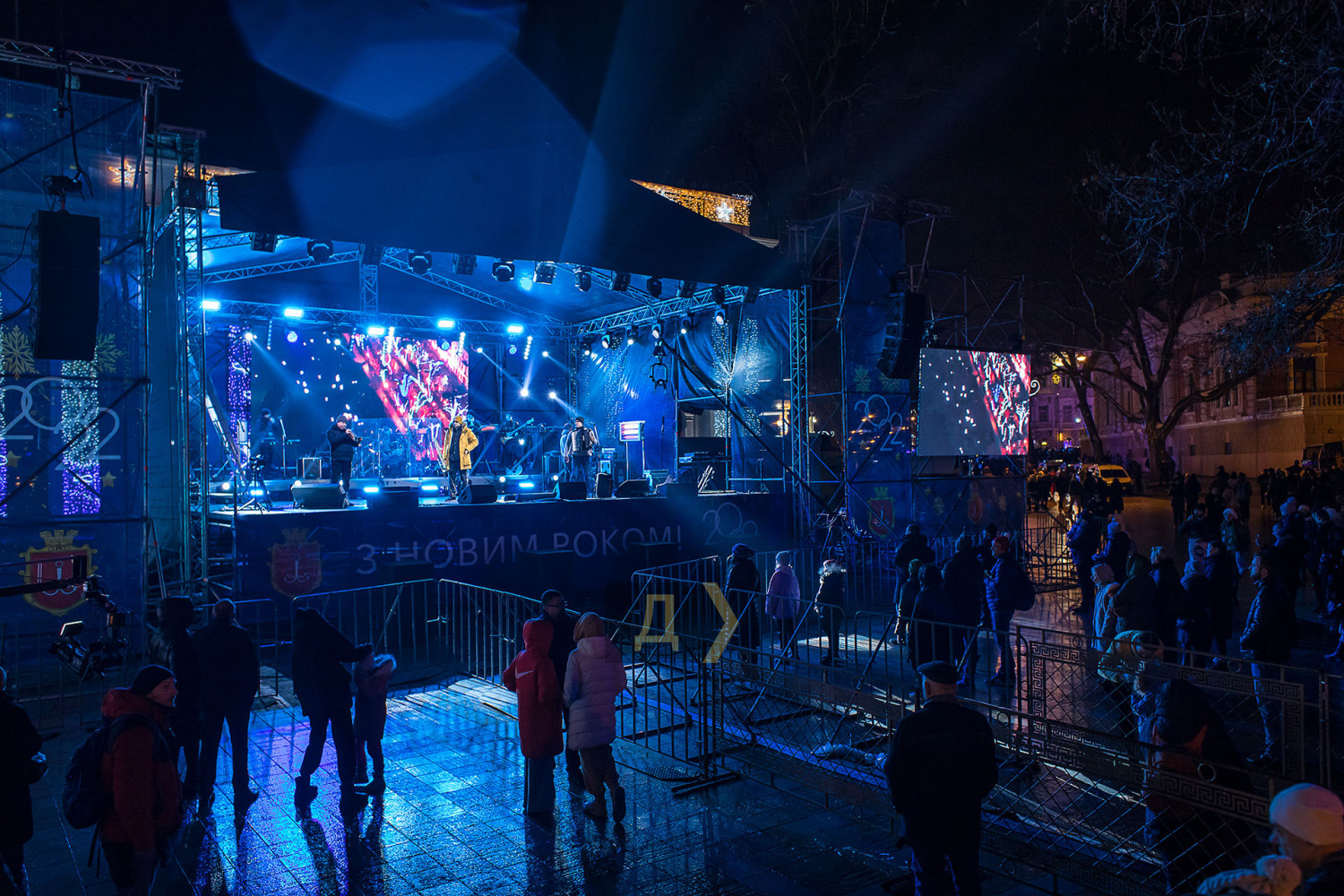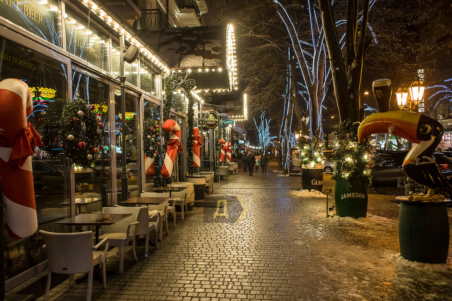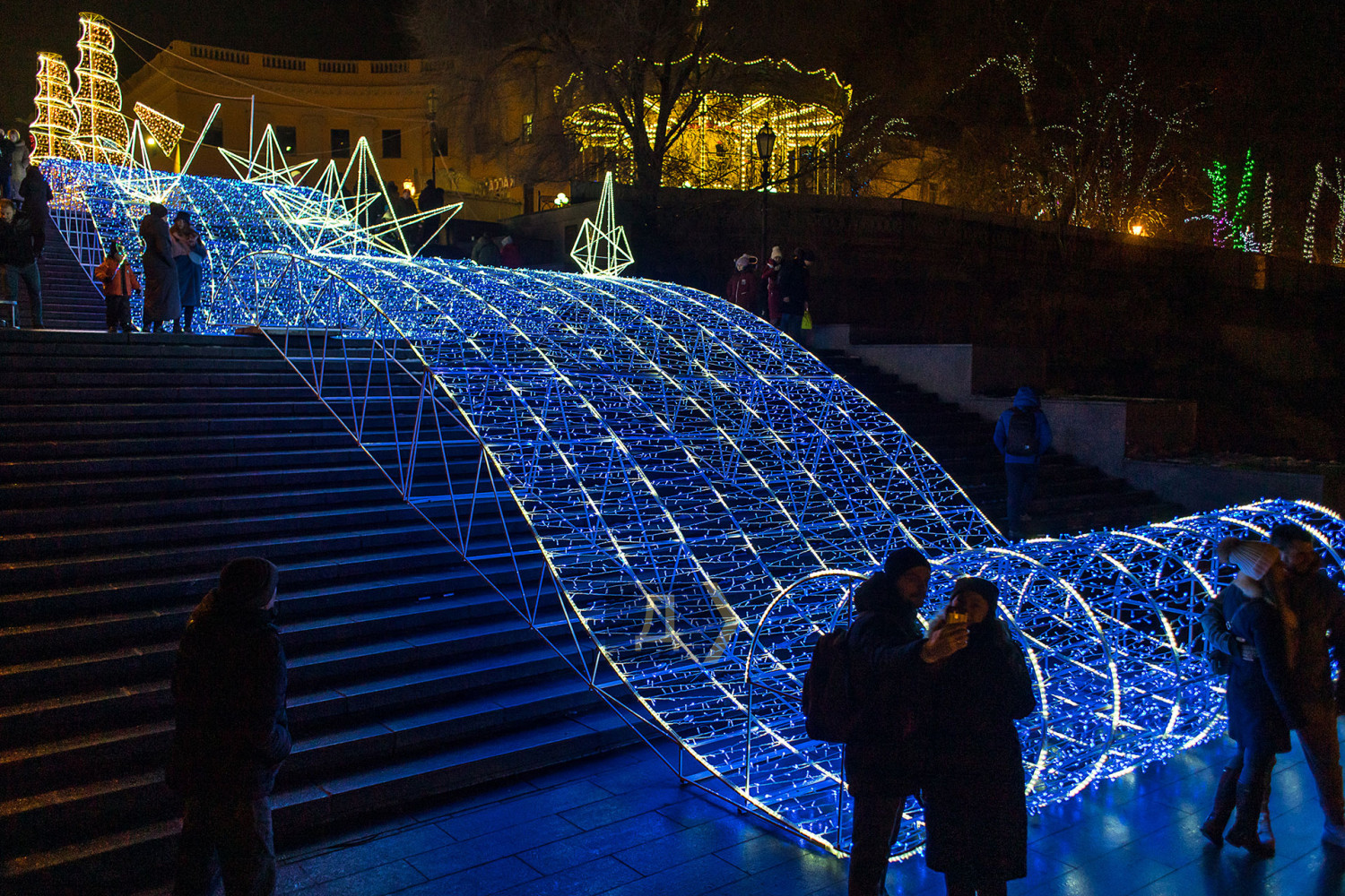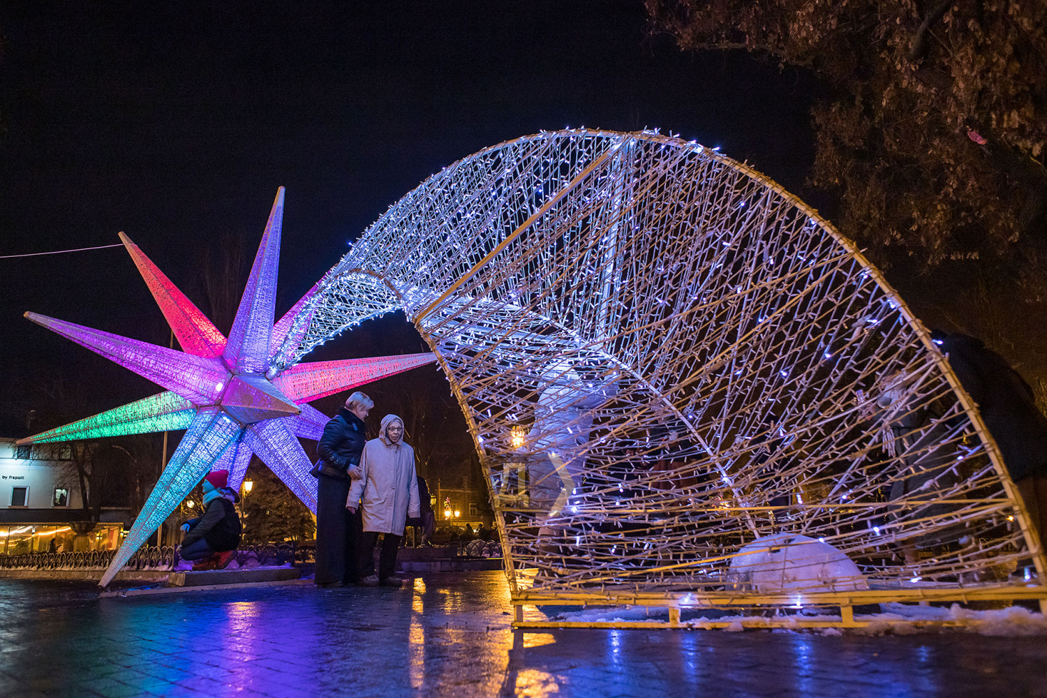 Корреспондент «Думской» прогулялся по вечернему городу, чтобы проникнуться праздничной атмосферой. Центр Одессы полон отдыхающих. Тем более, что тут есть на что посмотреть. Подрядчики успели смонтировать все заявленные светящиеся декорации, и теперь с Потемкинской лестницы скатывается огромная волна, а рядом с Дюком красуется парусник. Центральная клумба возле городского совета украшена светодиодным фонтаном, из центра которого практически выпрыгивает Нептун с трезубцем. Праздничную сцену установили заранее и в половину восьмого там уже разогревались музыканты. Вовсю работают ярмарки, как на Приморском бульваре, так и на Дерибасовской. Самый ходовой товар – глинтвейн и сладости. На главной улице города не протолкнуться. Здесь правят бал ряженые в новогодних персонажей и всевозможные ростовые куклы, требующие за фото с собой несколько гривен. Очень много людей пришли отдохнуть в центр семьями с детьми, а откровенно пьяных маргиналов единицы. Впрочем, даже если они и рискнут нарушать общественный порядок, то их ждет быстрая кара. Мы стали свидетелями довольно внушительного и одновременно романтичного развода военнослужащих Национальной гвардии возле археологического музея. Один из стражей порядка сделал предложение своей девушке прямо перед тем, как отправиться на праздничные улицы оберегать наш с вами покой. С Новым годом! Автор — Александр Гиманов СМЕРТЬ РОСІЙСЬКИМ ОКУПАНТАМ! Помітили помилку? Виділяйте слова з помилкою та натискайте control-enter |