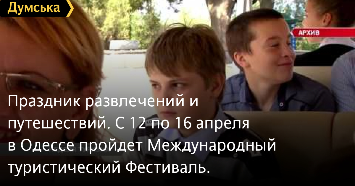 Праздник развлечений и путешествий. С 12 по 16 апреля в Одессе пройдет Международный туристический Фестиваль.Праздник развлечений и путешествий. С 12 по 16 апреля в Одессе пройдет Международный туристический Фестиваль. СМЕРТЬ РОССИЙСКИМ ОККУПАНТАМ! Заметили ошибку? Выделяйте слова с ошибкой и нажимайте control-enter Думская ТВ. Сюжеты: