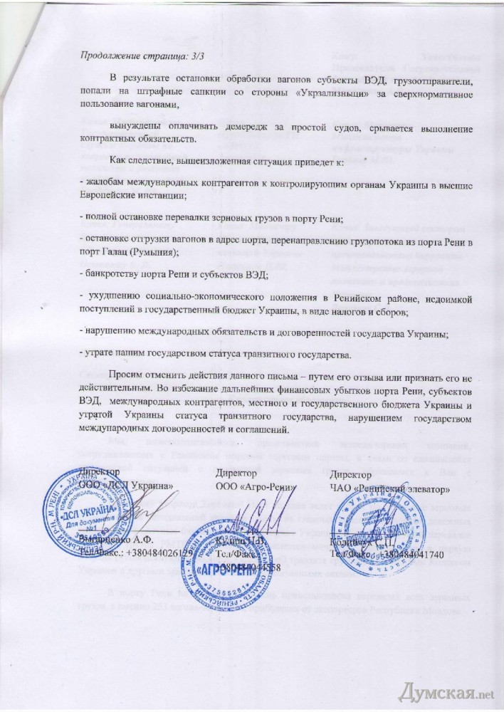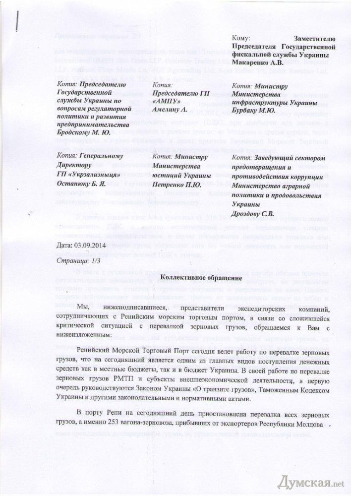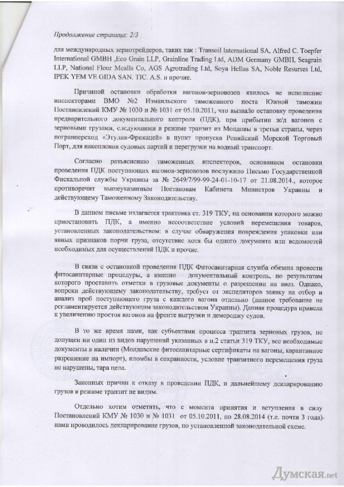 Предприниматели: Фискальная служба блокирует перевалку зерна через Ренийский порт (документ)Представители экспедиторских компаний и зернотрейдеры, работающие в Ренийском морском торговом порту, написали открытое письмо на имя руководителей ряда государственных ведомств, требуя прекратить произвол Фискальной службы Украины, которая блокирует перевалку зерновых грузов через предприятие. Как отмечается в документе, ситуация в порту критическая. В частности, в Рени простаивают 253 вагона-зерновоза из Молдавии, предназначенные для международных зернотрейдеров. Дело в том, что инспекторы Измаильского таможенного поста остановили проведение предварительного документального контроля (ПДК) при прибытии вагонов с зерном, следующем в режиме транзита из Молдовы в третьи страны через порт Рени. Таможенники ссылаются на письмо от Государственной фискальной службы, которое, как отмечают предприниматели, противоречит действующему законодательству. В частности, Таможенный кодекс позволяет приостановить ПДК из-за несоответствия условий перемещения товаров, в случае повреждения упаковки, явных признаков порчи груза, отсутствия хотя бы одного документа и пр. Между тем, зернотрейдеры утверждают, что работают строго по закону: у них есть все документы, пломбы целы, тара цела, условия транзитного перемещения груза не нарушены, все условия соблюдены и законных причин для отказа в ПДК нет. Усугубляют ситуацию действия фитосанитарной службы, отмечается в обращении. Ее сотрудники требуют от экспедиторов заявки на отбор и анализ проб зерна из каждого вагона, что не предусмотрено законом. В результате сроки простоя вагонов в буквальном смысле зашкаливают. В результате субъекты внешнеэкономической деятельности и грузоотправители платят штрафы «Укрзализныце» за сверхнормативное пользование вагонами и вынуждены оплачивать простой судов, у них срываются контракты. Предприниматели опасаются, что происходящее приведет к полной остановке перевалки зерновых грузов в Ренийском порту и перенаправлению грузопотока в румынский порт Галац. РМТП грозит банкротство. Авторы письма просят отменить действие письма Фискальной службы. СМЕРТЬ РОСІЙСЬКИМ ОКУПАНТАМ! Помітили помилку? Виділяйте слова з помилкою та натискайте control-enter |