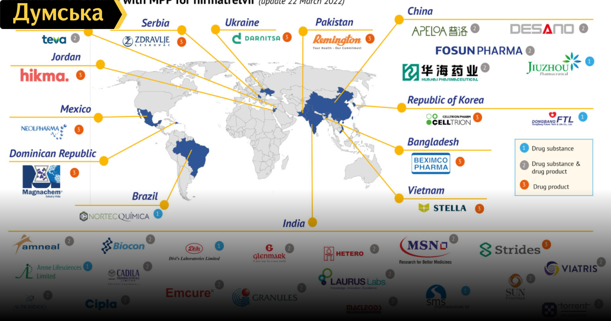 Предприятие «Дарница» будет производить новейшее лекарство против COVID-19 разработки компании PfizerУкраинская фармацевтическая компания «Дарница» победила в конкурсе и получила право производить аналог антивирусного препарата нирматрелвир от компании Pfizer. Об этом сообщил исполнительный директор «Дарницы» Дмитрий Шимкив. Согласно соглашению с «Медицинским патентным пулом», украинские фармацевты смогут производить это лекарство для лечения COVID-19 и продавать его в 95 странах мира, в том числе в Украине. Препарат нирматрелвир изобрели исследователи Pfizer. В ходе клинических испытаний, которые завершились в конце прошлого года, применение этого лекарства в сочетании с ритонавиром сокращало вероятность госпитализации и смертельного исхода до 89% у пациентов из групп риска. Аналоги этого препарата получила право производить компания «Дарница». «Медицинский патентный пул» (МПП) — организация, созданная ООН для обеспечения доступа к современным лекарствам для государств с низким и средним доходом. Компания Pfizer подписала договор с МПП о лицензировании производства доступных аналогов (генериков) нирматрелвира в ноябре 2021 года. Согласно договору, Pfizer не будет претендовать на лицензионные отчисления от продаж генериков в странах с низким доходом, пока ВОЗ классифицирует COVID-19 как международную угрозу общественному здоровью. Это позволяет значительно (в десятки раз) снизить их стоимость. По итогам проведенного МПП конкурса было отобрано 36 производителей, среди которых и «Дарница». Они получили право производить аналоги под собственными торговыми марками. В странах с высоким доходом будет продаваться исключительно оригинал — препарат от компании Pfizer. «Мы рады, что «Дарница» смогла подписать с нами сублицензионный договор в такое непростое время. Это первый раз, когда мы предоставили сублицензию украинской компании, — сказал Чарльз Гор, исполнительный директор МПП. — Мы предложим всю возможную поддержку «Дарнице», чтобы обеспечить людям доступ к этому важному противовирусному средству от COVID-19». Помимо Украины, генерики нирматрелвира будут производить в Индии, Израиле, Южной Корее, Иордании, Доминикане, Бразилии, Пакистане, Бангладеш, Мексике, Сербии, во Вьетнаме и в Китае. Помітили помилку? Виділяйте слова з помилкою та натискайте control-enter |