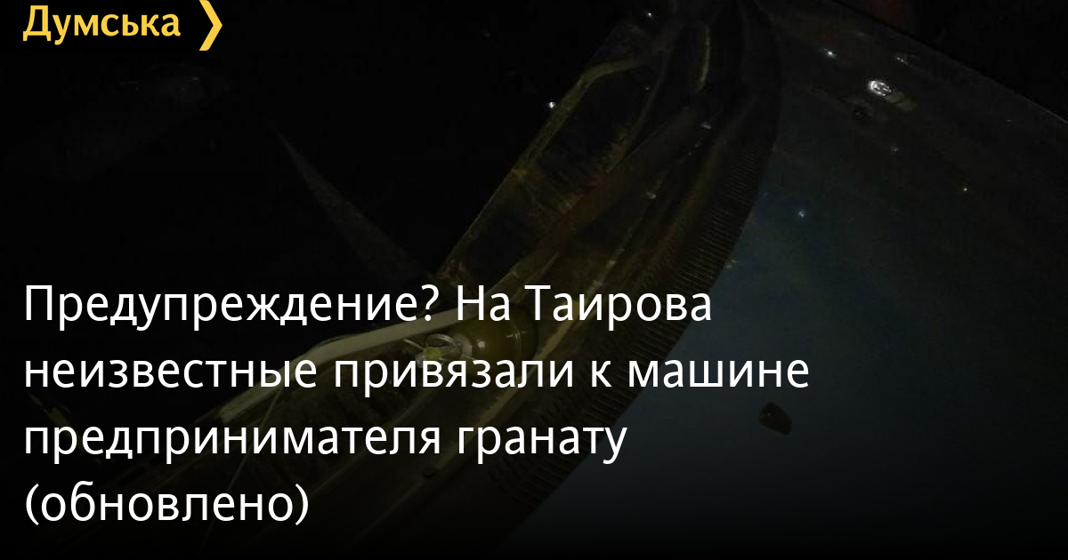 Предупреждение? На Таирова неизвестные привязали к машине предпринимателя гранату (обновлено)Предмет, похожий на гранату РГД-5, был обнаружен сегодня вечером на машине, принадлежащей одесскому предпринимателю Анне Г. Как сообщают источники «Думской» в правоохранительных органах, автомобиль «Хюндай» стоял возле дома №59 по улице Академика Вильямса. Кто-то привязал подозрительный предмет к дворнику авто. Сейчас находку проверяют специалисты. По нашим данным, у Анны Г. - конфликт с одним из ломбардов города. Связаны ли эти события, пока не известно. ОБНОВЛЕНО в 20:30. Проверка показала, что найденный предмет является массо-габаритным макетом гранаты РГД-5. Видимо, предпринимателя хотели просто припугнуть. СМЕРТЬ РОССИЙСКИМ ОККУПАНТАМ! Заметили ошибку? Выделяйте слова с ошибкой и нажимайте control-enter |