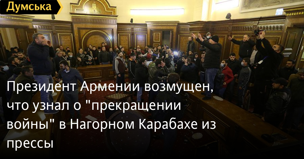 Президент Армении возмущен, что узнал о «прекращении войны» в Нагорном Карабахе из прессыПрезидент Армении Армен Саркисян выразил возмущение относительно того, что соглашение о прекращении войны в Нагорном Карабахе было подписано без консультаций с ним. Об этом сообщает «Европейская правда». Саркисян заявил, что узнал из прессы о том, что президенты РФ и Азербайджана подписали заявление о прекращении войны в Нагорном Карабахе. «Из прессы я узнал также об условиях прекращения войны. Относительно этого документа со мной, как с президентом Республики каких-либо совещаний или обсуждений, к сожалению, не было, ни в каких переговорах я не участвовал», — отметил президент. По его словам, урегулирование карабахского конфликта — это «вопрос общенационального значения», а потому любой шаг в его отношении «должен быть предметом всесторонних консультаций и обсуждений». «Учитывая обусловленную сложившейся ситуацией глубокую озабоченность большой массы народа, безотлагательно инициирую политические консультации с целью в кратчайшие сроки согласовать решения, вытекающие из нашей повестки защиты общенациональных интересов», — подчеркнул Саркисян. Напомним, что в Армении многие восприняли подписанный президентами РФ и Азербайджана, а также премьер-министром Армении документ, как капитуляцию. Недовольные этим решением демонстранты захватили здание правительства Армении, заняли места президиума и депутатов, требуя, чтобы к ним пришел премьер-министр Армении Никол Пашинян. Тысячи человек вышли на улицы Еревана и собрались у здания правительства и дома премьер-министра. СМЕРТЬ РОССИЙСКИМ ОККУПАНТАМ! Заметили ошибку? Выделяйте слова с ошибкой и нажимайте control-enter |