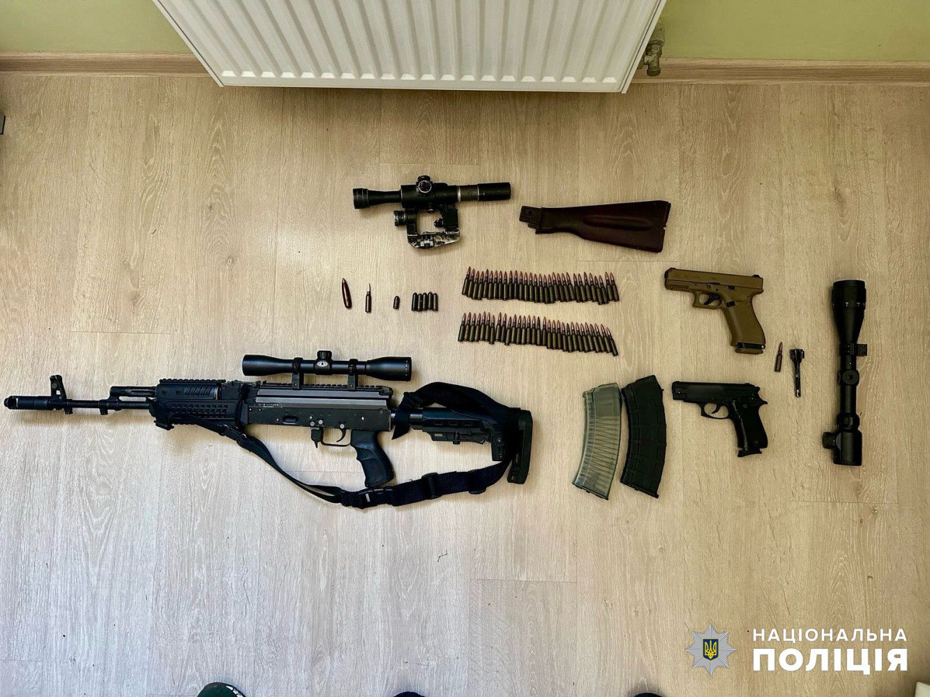 Під час обшуку за місцем проживання зловмисника правоохоронці знайшли автомат, два магазини до нього, приціл, майже 70 набоїв різного калібру та понад 100 грамів пороху.