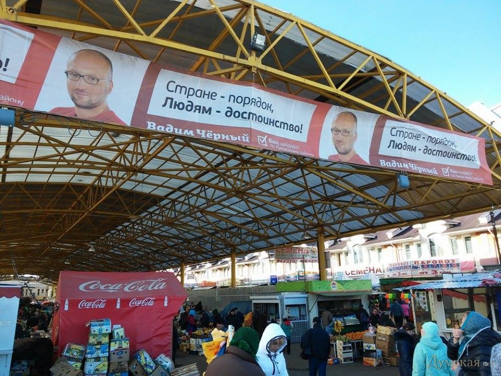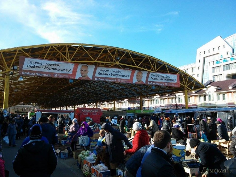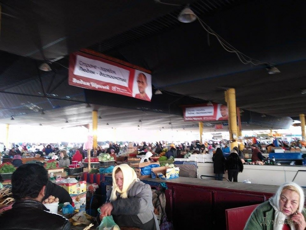 На Привозе — море агитации, призывающей голосовать за кандидата, который баллотируется в Киевском районе Одессы.