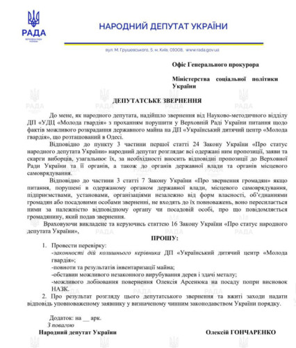Прокуратура перевірить факти можливого розкрадання держмайна в одеській «Молодій гвардії»Кримінальне провадження за фактом розкрадання майна в одеському таборі «Молода гвардія» відкрила прокуратура області. Як повідомив народний депутат від «Європейської Солідарності» Олексій Гончаренко, відомості в ЄРДР з попередньою кваліфікацією за ч. 2 ст. 191 КК України (привласнення, розтрата або заволодіння чужим майном шляхом зловживання посадовою особою своїм службовим становищем) внесли після його звернення до Офісу генпрокурора. «Після мого депутатського звернення прокуратура внесла відомості до ЄРДР за фактами можливого розкрадання державного майна в ДП «Український дитячий центр «Молода гвардія». Йдеться про серйозні речі — привласнення або розтрату державного майна. Тому потрібно розбиратися», — зазначив Гончаренко. У своєму зверненні нардеп просить перевірити законність дій колишнього керівника «Молодої гвардії», повноту і результати інвентаризації майна табору, лобіювання повернення Олексія Арсенюка на посаду керівника центру незважаючи на висновки НАПК. Нагадаємо, що в 2023 році «Думська» писала про те, що табір хочуть приватизувати, оскільки він відсутній у списку об'єктів, що не підлягають продажу. Через повномасштабну війну дитячий центр простоює. Тільки в 2022 році чистий збиток держпідприємства склав 381 тис. грн. Як повідомляли наші джерела, через те, що у держави немає грошей підтримувати «Молоду гвардію», її можуть спочатку віддати в оренду, а з часом продати. Син колишнього гендиректора «Молодої гвардії» Олексія Арсенюка — народний депутат України від «Слуги народу» Олег Арсенюк у той час, коли батько очолював дитячий центр, засідав у парламентському комітеті з питань соцполітики та захисту прав ветеранів. Табір, до речі, управляється Міністерством соціальної політики. З 6 червня 2025 року в «Молодій гвардії» змінився керівник. Зараз обов'язки гендиректора виконує Андрій Юрченко. Після нашої публікації Одеська облрада занепокоїлася долею табору і звернулася до Кабміну з проханням про внесення цього держпідприємства до переліку об'єктів державної власності, що не підлягають приватизації. СМЕРТЬ РОСІЙСЬКИМ ОКУПАНТАМ! Помітили помилку? Виділяйте слова з помилкою та натискайте control-enter