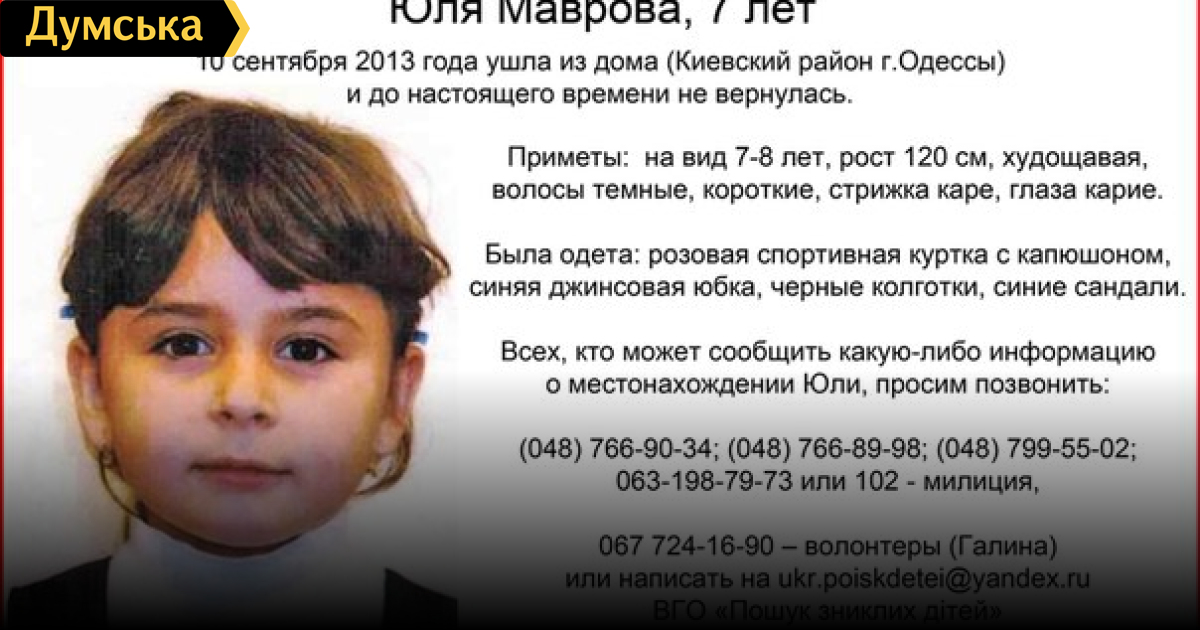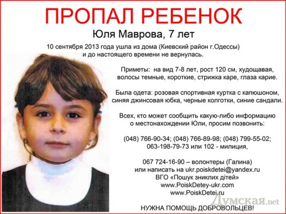 К поискам 7-летней Юлии Мавровой, которая пропала вчера утром, подключились добровольцы и волонтеры Службы поиска детей. Как рассказали волонтеры, вчера девочку искали до поздней ночи, но безрезультатно. Сегодня утром поиски возобновили. Как сообщалось ранее, Юля Маврова вышла из дома на Люстдорфской дороге утром 10 сентября, но в школе так и не появилась. Домой девочка тоже не вернулась. Поисками Юли также занимается милиция. СМЕРТЬ РОСІЙСЬКИМ ОКУПАНТАМ! Помітили помилку? Виділяйте слова з помилкою та натискайте control-enter |