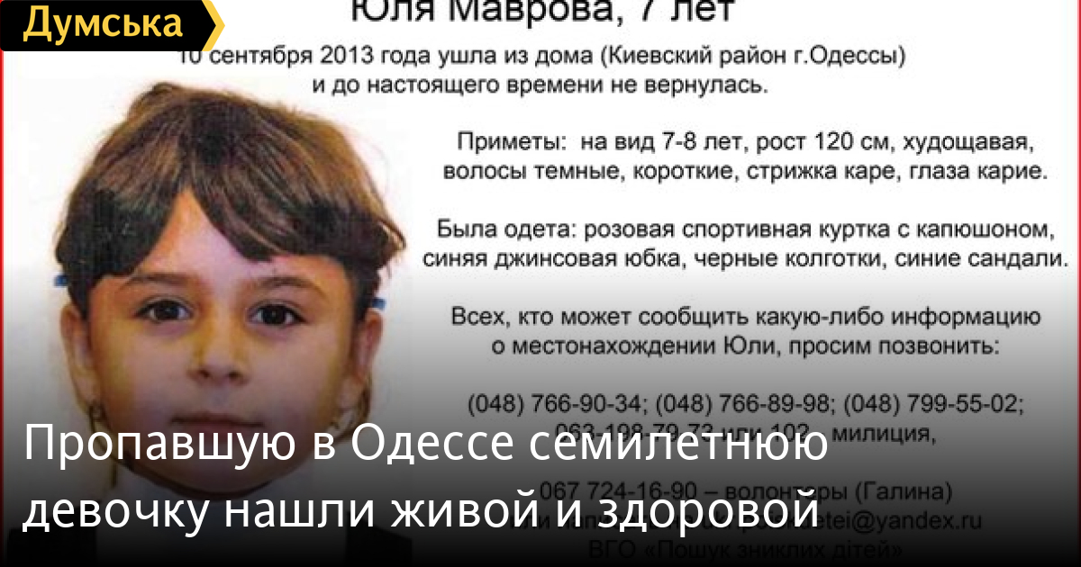 Семилетняя одесситка Юлия Маврова, которая пропала вчера вечером, нашлась. Об этом «Думской» сообщил руководитель пресс-центра облУВД Владимир Шаблиенко. По его словам, девочка «ночевала у подружки». Подробнее офицер пообещал рассказать позже. Как сообщалось ранее, Юля Маврова вышла из дома на Люстдорфской дороге утром 10 сентября, но в школе так и не появилась. Домой девочка тоже не вернулась. К поискам ребенка подключилась милиция и добровольцы. СМЕРТЬ РОСІЙСЬКИМ ОКУПАНТАМ! Помітили помилку? Виділяйте слова з помилкою та натискайте control-enter Новини по цій темі: 29 липня 2025: В Усатово Одеської області сталася перестрілка: поліція працює на місці (відео, оновлено) 28 липня 2025: П'яний на "Ягуарі" або гіпертонік? Звільнений топ-посадовець одеської поліції хоче повернутися на службу 19 червня 2025: Дівчинку, яку шукали сотні одеситів, знайшли вбитою: поліція працює з чоловіком, ймовірно причетним до загибелі 27 травня 2025: Увели гектар в університету: на Одещині засудили земельних аферистів, але без посадки і Хвоста |