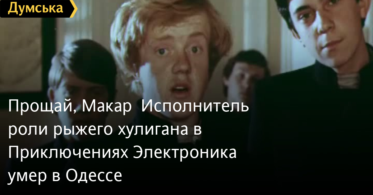 Прощай, Макар Исполнитель роли рыжего хулигана в «Приключениях Электроника» умер в ОдессеНа 62-м году жизни после тяжелой болезни перестало биться сердце одессита Василия Скромного, известного по роли Макара Гусева из культового фильма Константина Бромберга «Приключения Электроника». Детвора 80-х обожала и этот фильм, снятый на Одесской киностудии, и его героев, и веснушчатый проказник Макар Гусев с его отрицательным обаянием не был исключением. Ассистент режиссера Юлия Константинова случайно увидела мальчика, когда подбирала новые лица для фильма. Василий скатился по школьным перилам, чуть не сбив ее с ног. Долгие пробы не потребовались. В этом же фильме снимались тогдашние звезды советского кино Николай Гринько, Владимир Басов, Евгений Весник, и все юные актеры также быстро стали знаменитостями. По собственному признанию, Василий не столько играл, сколько был самим собой в кадре. Роман с кино продолжился, парень снялся еще в шести фильмах (в том числе «Школа», «Третье измерение» и «Комбат»), закончил студию киноактера при Одесской киностудии, но потом продолжил семейную традицию, закончил высшую мореходку, работал на судах загранплавания боцманом. Побывал в Южной Америке, Африке, Австралии и на Кубе. Был не против вернуться на съемочную площадку, сыграв повзрослевшего Макара Гусева, но жизнь распорядилась иначе. Актеры могут взрослеть, некоторые персонажи – нет, Макар навсегда остался рыжим солнышком, с которым взрослым непросто, зато весело. СМЕРТЬ РОССИЙСКИМ ОККУПАНТАМ! Заметили ошибку? Выделяйте слова с ошибкой и нажимайте control-enter |