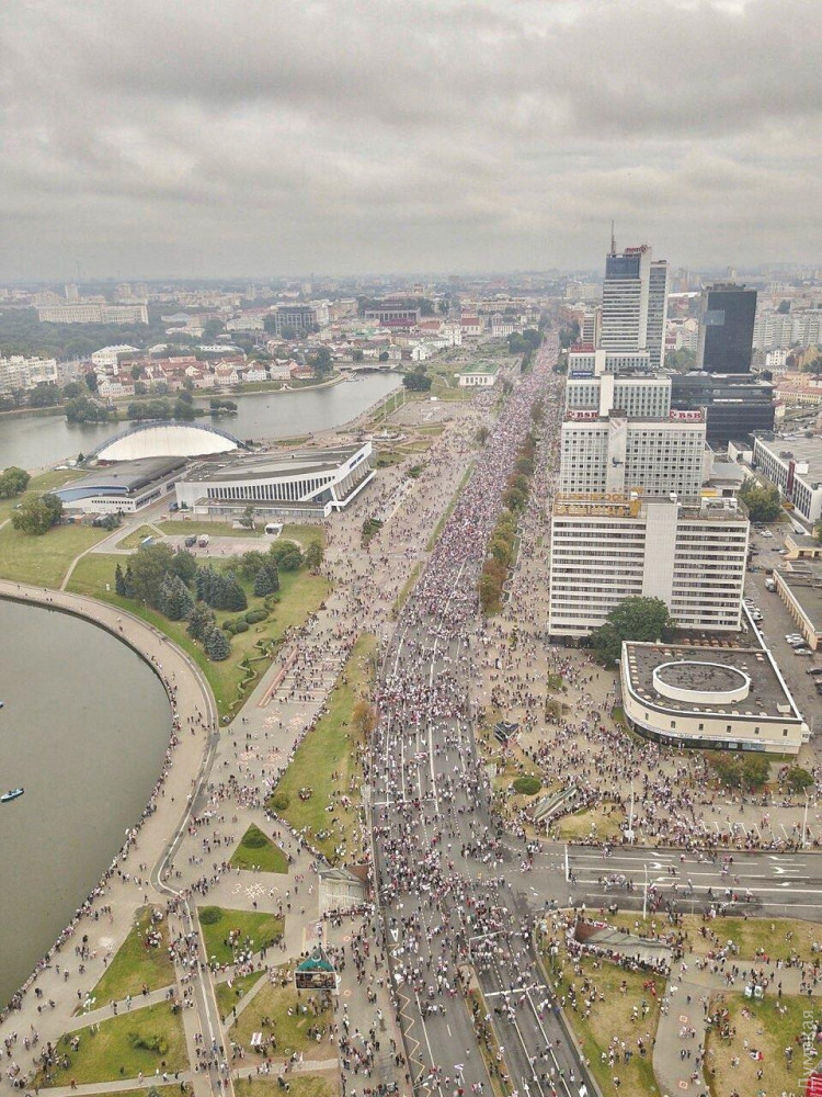 Только на площади Независимости у Дома правительства в Минске днем собралось более 200 тысяч протестующих, которые скандировали «Уходи!», а в 15:30 устроили минуту молчания по погибшим участникам акций протестов.