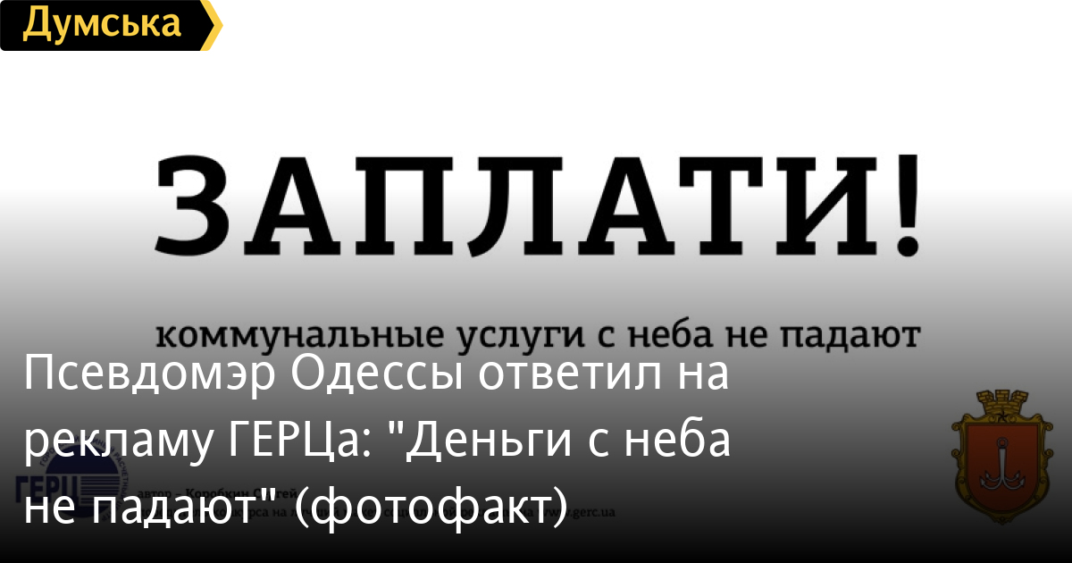 Псевдомэр Одессы ответил на рекламу ГЕРЦа: «Деньги с неба не падают» (фотофакт)На «фейковую» страницу мэра Одессы в «Фейсбуке» выложили своеобразный ответ на появившуюся недавно социальную рекламу ГЕРЦа, призывающую горожан исправно оплачивать коммунальные услуги. На ГЕРЦовское «Заплати» неизвестные шутники отвечают по-старорусски «Хрен вам!» СМЕРТЬ РОССИЙСКИМ ОККУПАНТАМ! Заметили ошибку? Выделяйте слова с ошибкой и нажимайте control-enter |