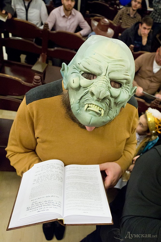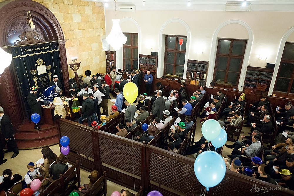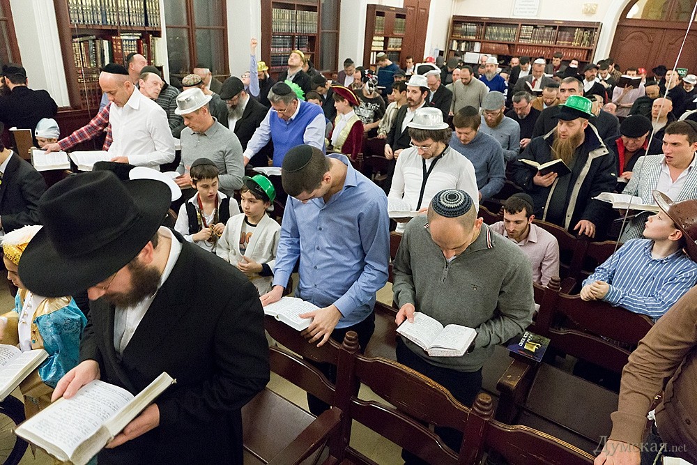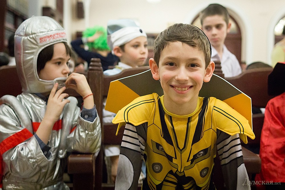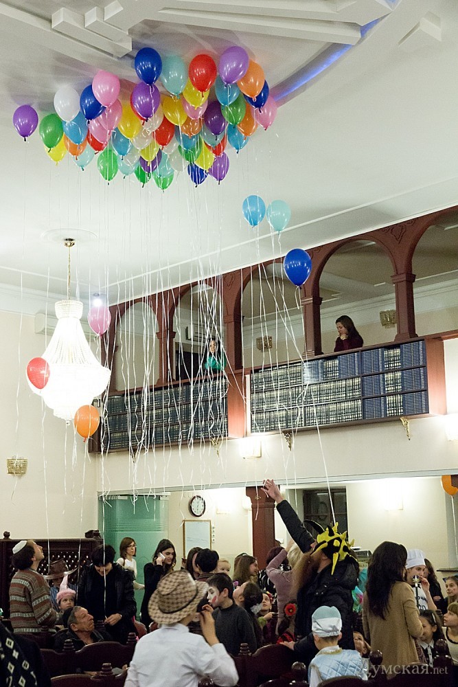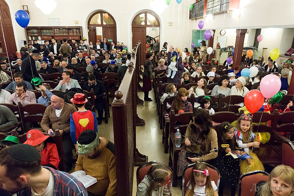 Перед общей молитвой и совместным чтением свитка Есфири, где описываются подробности чудесного спасения еврейского народа, прошел детский утренник. Ребятишки и многие взрослые были одеты в самые причудливые карнавальные костюмы: пирата, человека-паука, зомби, супермена, а некоторые и в украинские вышиванки. Детям показывали фокусы, а после совместной молитвы дарили вкусные подарки. Обязательное лакомство в этот день — гоменташ («уши Амана»), печенье со сладкой начинкой.