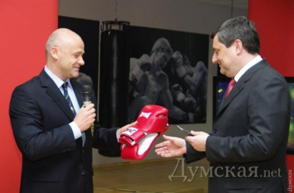 Геннадій Труханов вручає боксерські рукавички Едуарду Матвійчуку, березень 2011 року