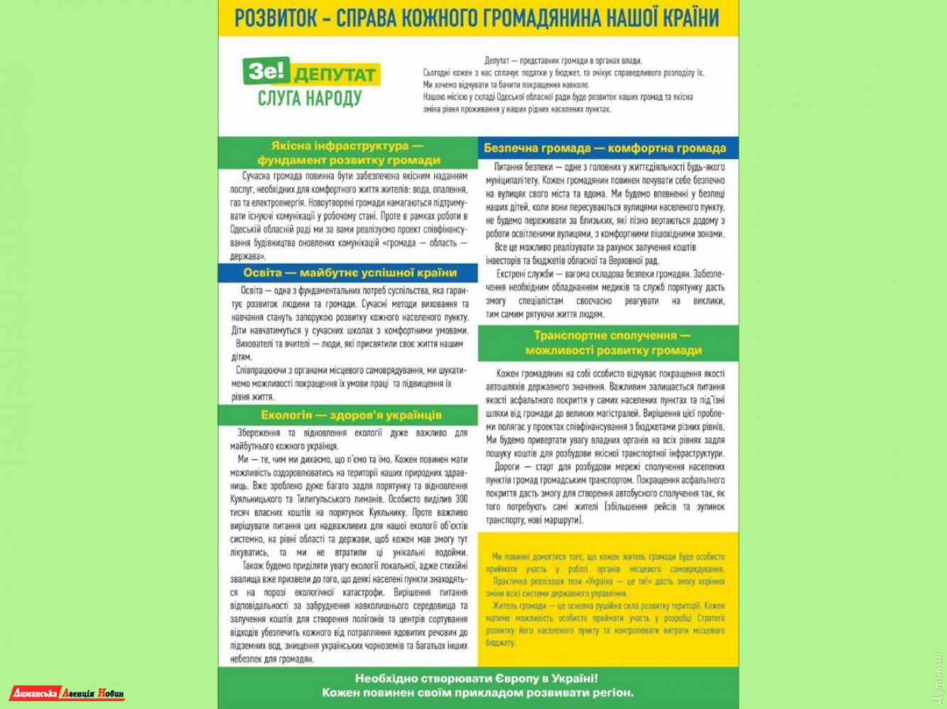Пять пунктов Кутателадзе: депутат Одесского облсовета презентовал свою программу на следующую каденцию (политика)Депутат Одесского областного совета и кандидат в депутаты от партии «Слуга народа» Олег Кутателадзе представил свою программу. Программа состоит из пяти главных пунктов: «1. Качественная инфраструктура — фундамент развития общества. Современная громада должна быть обеспечена предоставлением качественных услуг, необходимых для комфортной жизни жителей: вода, отопление, газ и электроэнергия. Вновь созданные громады пытаются поддерживать существующие коммуникации в рабочем состоянии. Работая в Одесском областном совете, мы с вами реализуем проекты софинансирования строительства обновленных коммуникаций в варианте «громада — область — государство». Развитие коммунальной сферы даст значительный толчок к привлечению инвестиционных проектов, обеспечит громады новыми рабочими местами и поступлениями средств в бюджет. 2. Безопасная громада — комфортная громада. Вопрос безопасности — один из главных в жизнедеятельности любого населенного пункта. Каждый гражданин должен чувствовать себя безопасно на улицах своего города и у себя дома. Мы будем уверены в безопасности наших детей, когда они передвигаются по улицам населенного пункта, не будем переживать за близких, которые поздно возвращаются домой с работы по освещенным улицам, с комфортными пешеходными зонами. Все это возможно реализовать путем привлечения средств инвесторов и бюджетных средств, при участии областного совета и Верховной Рады. 3. Образование — будущее успешной страны. Образование — одна из фундаментальных потребностей общества, которая гарантирует развитие человека и громады. Современные методы воспитания и обучения станут залогом развития каждого населенного пункта. Дети будут учиться в современных школах в комфортных условиях. Воспитатели и учителя — люди, которые посвятили свою жизнь нашим детям. Сотрудничая с органами местного самоуправления, мы будем искать возможности улучшения условий их труда и повышения их уровня жизни педагогов. 4. Транспортное сообщение — возможности развития громады. Каждый гражданин на себе лично чувствует улучшение качества автодорог государственного значения. Важным остается вопрос состояния асфальтового покрытия в самих населенных пунктах и подъездные пути от сел и поселков к большим магистралям. Решение этой проблемы заключается в проектах софинансирования с бюджетами разных уровней. Мы будем привлекать внимание органов власти на всех уровнях для поиска средств на развитие качественной транспортной инфраструктуры. Дороги — старт для развития сети сообщения между населенными пунктами общественным транспортом. Улучшение асфальтового покрытия позволит обеспечить автобусное сообщении так, как того требуют сами жители (увеличение количества рейсов и остановок транспорта, новые маршруты). 5. Экология — здоровье украинцев. Сохранение и восстановление экологии очень важно для будущего каждого украинца. Мы — то, чем мы дышим, что пьем и едим. Каждый должен иметь возможность оздоровиться на территории наших природных здравниц. Уже сделано немало для спасения и восстановления Куяльницкого и Тилигульского лиманов». Кутателадзе отмечает, что лично выделил 300 тыс. грн из собственных средств 
