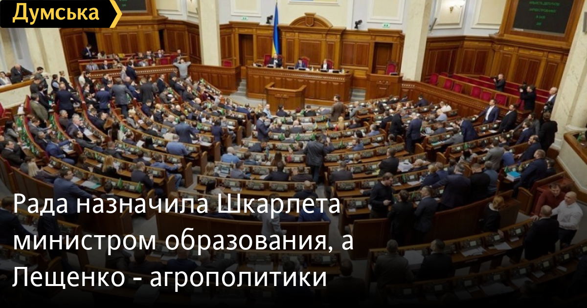Верховная Рада Украины назначила Сергея Шкарлета министром образования и науки Украины. Об этом стало известно в ходе заседания парламента. До этого он с июня 2020 года исполнял обязанности главы Минобразования. За его назначение проголосовало минимально необходимое количество народных избранников — 226. Шкарлет зачитывал текст присяги под возгласы «Ганьба!». Представители фракции «Слуга народа» заглушали возгласы аплодисментами. После чего в зале раздались возгласы «Геть!». Отметим, что парламентский комитет по вопросам образования, науки и инноваций не поддержал его кандидатуру. Изначально кандидатура Шкарлета на эту должность вызвала недовольство в связи с обвинениями в плагиате, обнаруженном в его научных работах. Сегодня Рада также назначила главу Госгеокадастра Романа Лещенко министром аграрной политики и продовольствия Украины. За это решение проголосовали 242 нардепа. Стоит отметить, что его кандидатуру поддержал профильный комитет ВР. Сам Лещенко заявил о «восстановлении исторической справедливости» по возобновлению работы МинАПК. СМЕРТЬ РОССИЙСКИМ ОККУПАНТАМ! Заметили ошибку? Выделяйте слова с ошибкой и нажимайте control-enter |