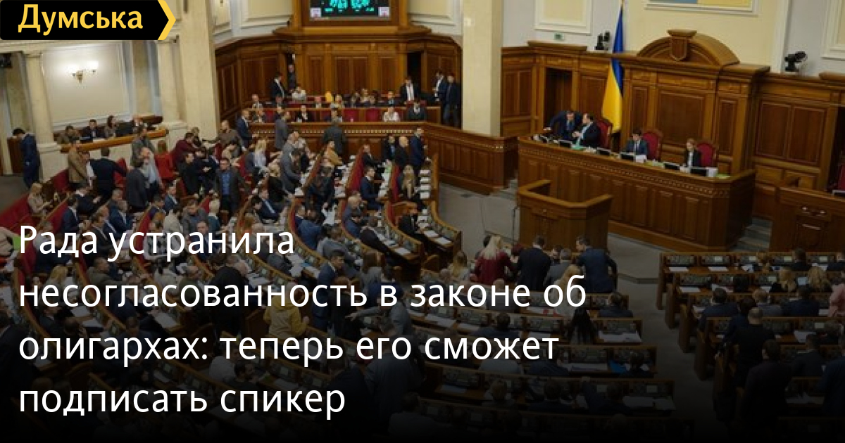 Рада устранила несогласованность в законе об олигархах: теперь его сможет подписать спикерВерховная рада устранила противоречия и несогласованности в проголосованном законопроекте об олигархах и теперь документ сможет подписать спикер парламента. Об этом стало известно в ходе заседания парламента. Предложение Комитета Верховной рады по вопросам национальной безопасности, обороны и разведки поддержали 252 депутата. Теперь вести реестр олигархов будет Совет национальной безопасности и обороны (СНБО), как и настаивали в Офисе президента. Рада также уточнила определение статуса олигарха и утвердила пункт, согласно которому обязательным станет заслушивание устных объяснений лица, которого вносят в реестр олигархов. Решения поддержали нардепы из «Слуги народа» и групп «Доверие» и «За будущее». Кроме того, ВР поручила главе парламента Руслану Стефанчуку незамедлительно подписать законопроект и передать его на подпись президенту. СМЕРТЬ РОССИЙСКИМ ОККУПАНТАМ! Заметили ошибку? Выделяйте слова с ошибкой и нажимайте control-enter |
