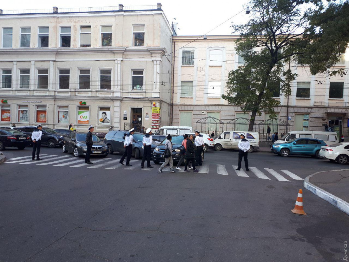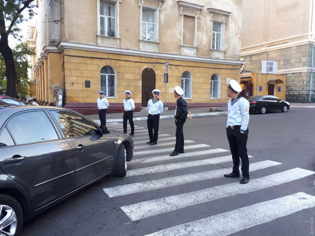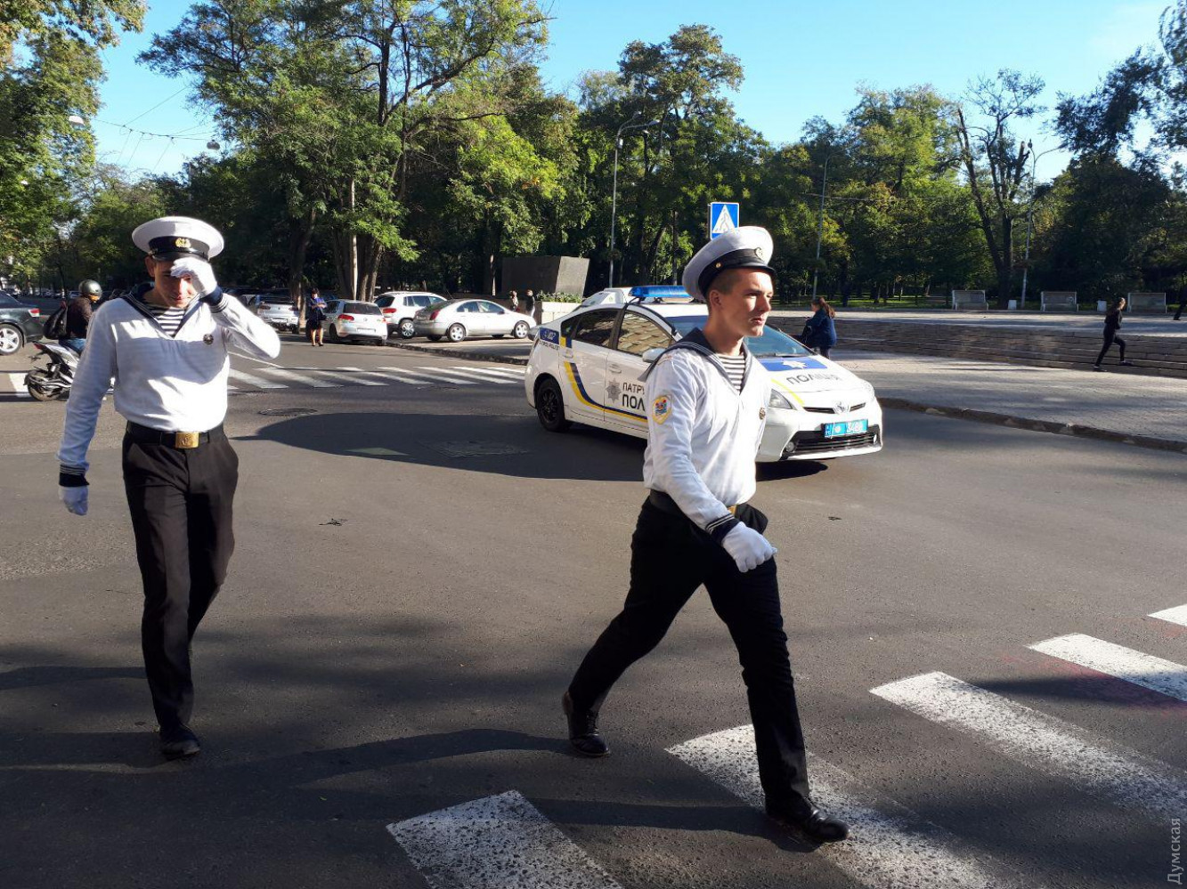 Работу патрульных выполняли сегодня курсанты старших курсов Одесского мореходного училища имени Маринеско. Парни в форме перекрывали проезжую часть на нескольких улицах. В частности, не пропускали машины по Сабанскому переулку, при въезде на Маразлиевкую и Успенскую — к большому неудовольствию автомобилистов, рискуя нарваться на грубость и даже быть задавленными.
