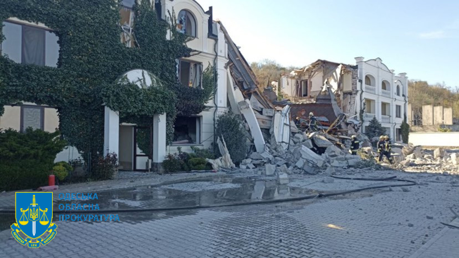 В этом помещении был пожар вследствие атаки. Спасатели до сих пор проливают.