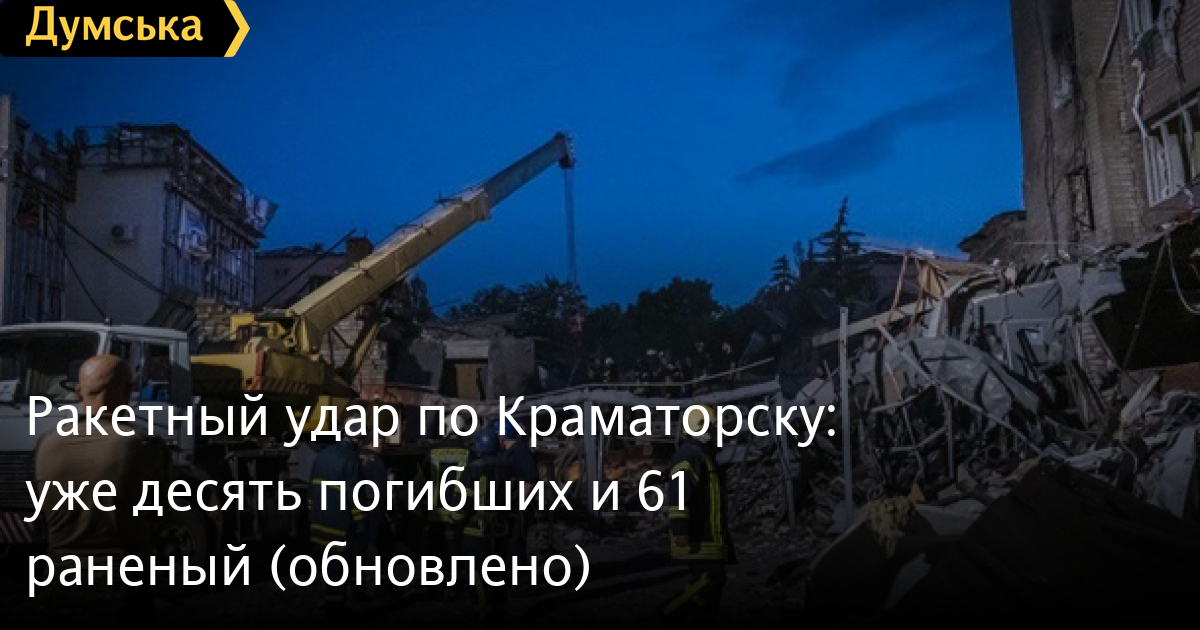 Ракетний удар по Краматорську: уже десять загиблих і 61 поранений (оновлено)Рятувальники продовжують розбирати завали піцерії в центрі Краматорська, куди 27 червня прилетіла ворожа ракета С-300. Наразі відомо вже про дев'ятьох загиблих, ще 60 осіб дістали поранення, повідомив заступник керівника Донецької обласної прокуратури Олександр Бакуменко. Серед загиблих три дитини — 17-річна дівчинка і дві 14-річні сестри-близнючки. Серед поранених — восьмимісячне немовля. Під завалами ще залишаються люди, насамперед — співробітники закладу. ОНОВЛЕНО О 13:44. Кількість загиблих збільшилася до десяти, поранено 61 людину, повідомили в Національній поліції. СМЕРТЬ РОСІЙСЬКИМ ОКУПАНТАМ! Помітили помилку? Виділяйте слова з помилкою та натискайте control-enter |