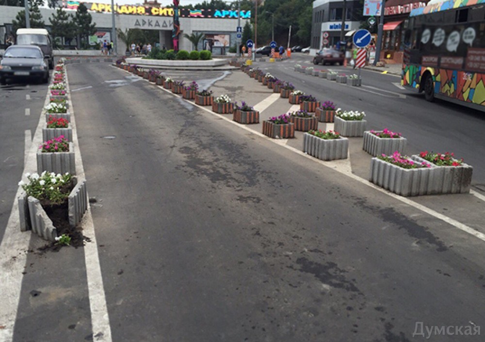 Зачем на дорогу выставлять клумбы?Грузовик мог не вписаться в поворот и задел это горшок.Возле аэропорта тоже понатыкали камней каких-то, из за них не разъехаться!!! .Аркадию очень жаль.Это убожество и безвкусица!