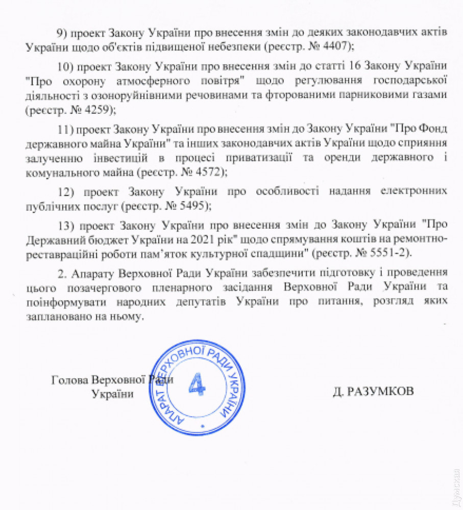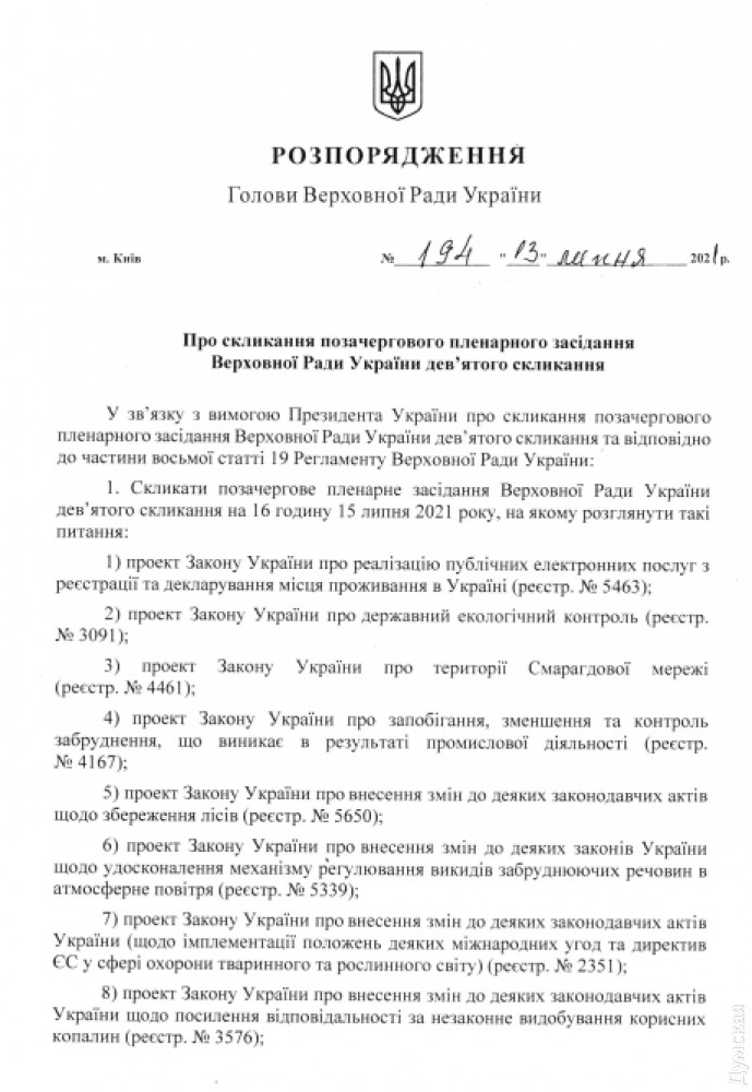 Внеочередное пленарное заседание парламента по требованию президента Владимир Зеленского состоится 15 июля в 16:00. Соответствующее распоряжение подписал председатель ВРУ Дмитрий Разумков. На предстоящем заседании парламентарии рассмотрят ряд законопроектов. Среди них — об электронной регистрации места жительства, о государственном экологическом контроле, сохранении лесов и прочие природоохранные проекты. Также будет рассмотрен проект закона «О территориях Изумрудной сети». Речь идет об охраняемых природных территориях особого природоохранного значения. Кроме того, депутаты рассмотрят изменения в госбюджет, которые предполагают направление средств на ремонтно-реставрационных работ памятников культурного наследия. Отметим, это второе внеочередное заседание парламента, которое созвал Дмитрий Разумков по требования президента на текущей пленарной неделе. СМЕРТЬ РОСІЙСЬКИМ ОКУПАНТАМ! Помітили помилку? Виділяйте слова з помилкою та натискайте control-enter |