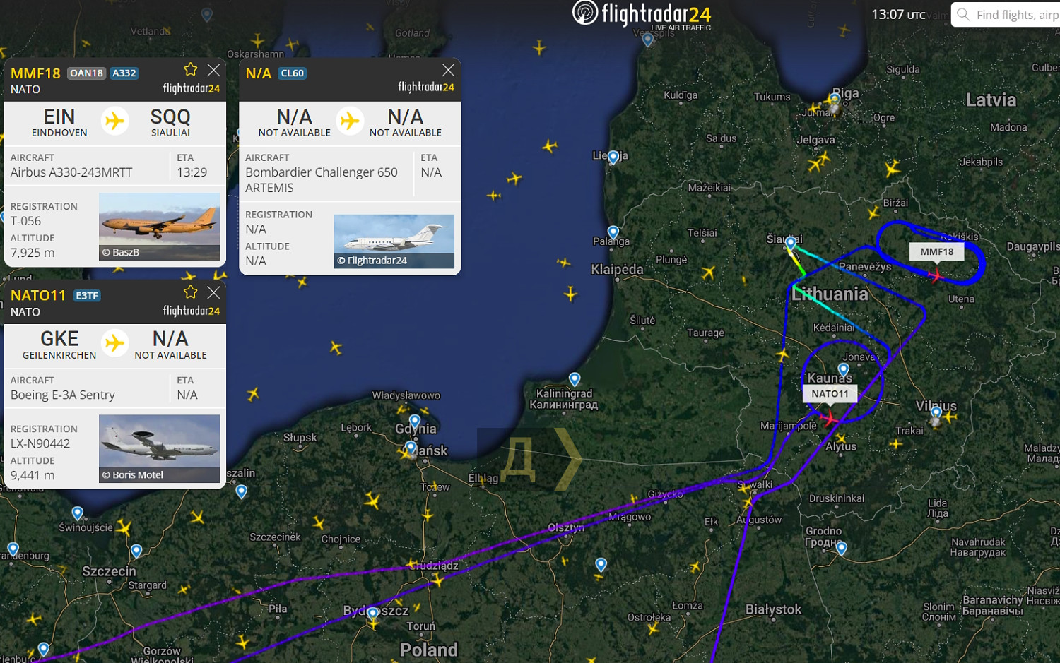 Розвідники НАТО зачищають небо над Литвою перед самітом АльянсуКілька літаків північно-атлантичного альянсу контролюють небо над Литвою напередодні саміту НАТО, який 11 липня має відкритися у Вільнюсі. У небі над литовською столицею зараз перебувають щонайменше три літаки, які моніторять можливі загрози. Над Каунасом намотує кола літаюча тарілка — літак дальнього радіолокаційного виявлення системи «Авакс» — Boeing E-3A Sentry. З висоти 10 тисяч метрів один Е-3А може постійно контролювати повітряний простір у радіусі понад 400 км і обмінюватися інформацією за допомогою цифрових каналів передавання даних із наземними, морськими та повітряними командними пунктами. Він може розрізняти цілі і давати раннє попередження про всі літаки та інші об'єкти, зокрема ракети. За наземними загрозами стежить розвідувальний літак CL-650 ARTEMIS, який до повномасштабного вторгнення рф в Україну не раз з'являвся над Чорним морем, контролюючи ситуацію в Криму. У небі перебуває також повітряний танкер Airbus A330-243MRTT, який може дозаправляти в небі не тільки натовські винищувачі, а й розвідники, несучи на борту понад 110 тонн палива. Треба зазначити, що перед самітом НАТО значно посилило ППО країн Балтії — туди доставили системи Patriot і NASAMS. Помітили помилку? Виділяйте слова з помилкою та натискайте control-enter |