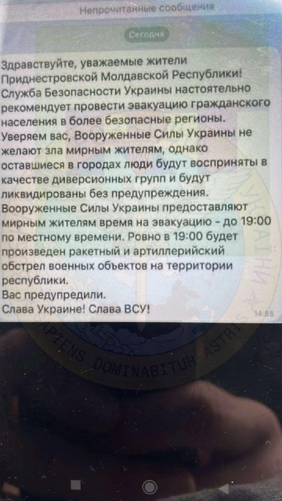 Разведка: россия готовит ракетный удар по территории Приднестровья с жертвами и хочет обвинить в этом УкраинуЖители непризнанного Приднестровья получают sms от имени Вооруженных сил и спецслужб Украины. Они содержат предупреждение о «ракетном и артиллерийском» ударе по территории «ПМР». Об этом сообщает Главное управление разведки МО Украины. «Служба безопасности Украины настоятельно рекомендует провести эвакуацию гражданского населения в более безопасные регионы. Уверяем, Вооруженные Силы Украины не желают зла мирным жителям, однако оставшиеся в городах люди будут восприняты в качестве диверсионных групп и будут ликвидированы без предупреждения. Ровно в 19:00 будут проведены ракетные и артиллерийские обстрелы объектов на территории республики», — говорится в сообщениях. Разведка также отмечает, что рассылку фейковых сообщений активно освещают пропагандистские информационные ресурсы рф. СМЕРТЬ РОСІЙСЬКИМ ОКУПАНТАМ! Помітили помилку? Виділяйте слова з помилкою та натискайте control-enter |