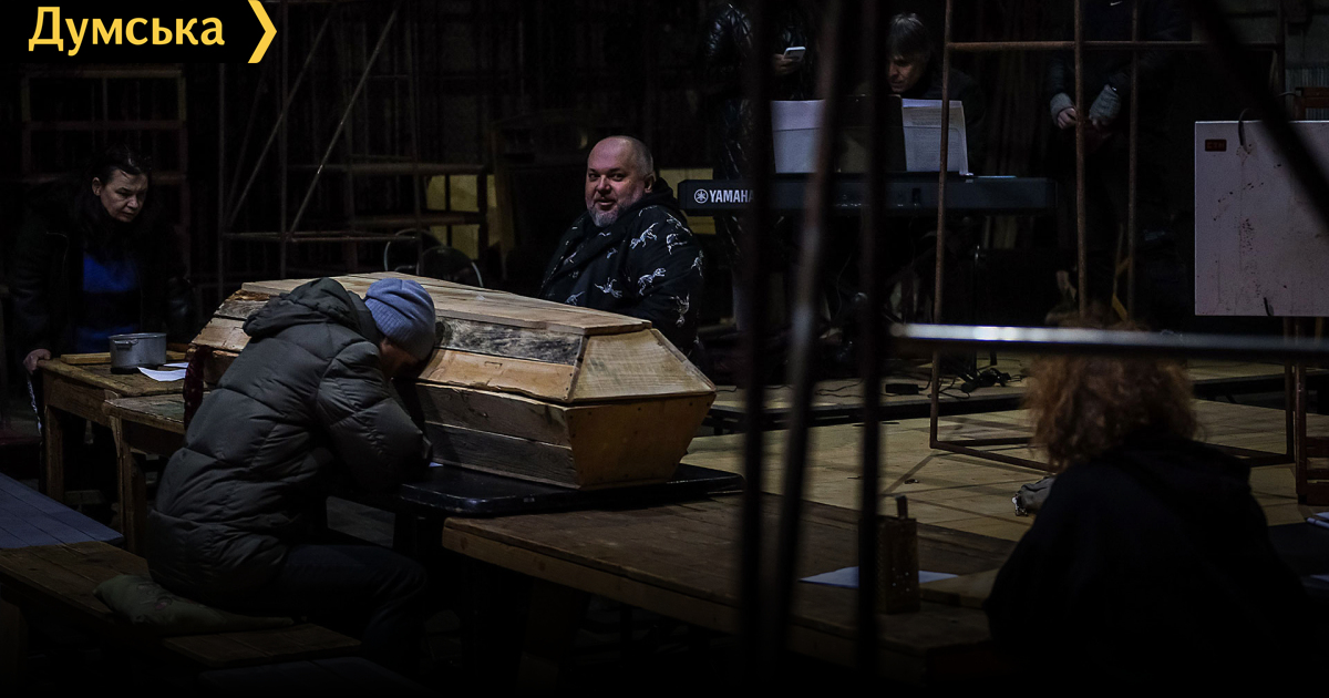Близится Международный день театра, но в условиях военного положения никто не озабочен веселым капустником, Мельпомена выжидает в укрытии. А в Одесском академическом украинском музыкально-драматическом театре имени Василия Василько как раз в рамках проекта «Театр в укрытии» начались репетиции спектакля по пьесе Натальи Ворожбит «Саша, вынеси мусор!». Ваша любимая «Думская» вместе с артистами пряталась в бомбоубежище (это когда завыли сирены, а так-то репетируют на сцене, где уже стоит гроб для главного героя, покинувшего этот мир еще до описываемых событий). Пьеса была написана в 2015 году, но сегодня она особенно актуальна. Сейчас герои занимаются подготовкой к поминкам полковника Саши. Находящаяся в оцепенении от горя вдова (заслуженная артистка Украины Ирина Охотниченко) раскатывает тесто для поминальных пирожков, но, возможно, на премьере будет его месить, монотонно и методично. По мнению другой исполнительницы, заслуженной артистки Украины Нинели Наточей, манипуляции со скалкой дадут процессу лишнюю в данном случае «физику», а еще хорошо бы «подоценить» степень готовности теста, оно не должно быть тугим, а героиня все месит и месит, утеряв связь с реальностью. Главреж театра, он же режиссер-постановщик Максим Голенко не возражает. Когда у него сорок человек на сцене, демократия неуместна, а в камерных сюжетах позволяет актерам искать варианты, нежно отказываясь от того, что «не заходит». «Мои спектакли так долго живeт еще и потому, что артисты не просто приходят в мой сумасшедшиq рисунок, а привносят свое, приходят со своим опытом, и материал становится общим делом. Вдова ведет диалог с беременной дочерью: «А людей скiльки буде?» — «Десь шiстдесят». – «А якщо бiльше прийде?». – «Дозакажемо». Роль дочери репетирует Инна Бульботко, актриса ищет натуралистичные краски, с аппетитом поглядывая на бутафорскую селедку (есть вероятность, что на премьеру принесут настоящую!). Режиссер советует поискать «животное начало», но все же не впадать в патологию. Достаточно легкого ощущения болезненности, неправильности, нарушенности. Терять близких людей – ненормально, хоть это и часть жизни, вот такой парадокс. Репетицию прерывает вой сирен, и актеры покидают селедку, гроб (другого реквизита пока нет), перемещаясь в бомбоубежище в театральном подвале. Собственно, премьеру планируется провести в одном из подвальных залов, прямо под сценой, даже в случае воздушной тревоги прерывать показ не придется. Играли уже на этой площадке на прошлом Литературном фестивале, публике понравилась локация. А в перспективе спектакль станет мобильным, его можно будет показать там, где он будет больше всего нужен, вне стен театра. «Выбор пьесы произошел достаточно спонтанно, — говорит Максим Голенко. – Я очень люблю Наташину драматургию невероятную, и очень много ставил: и «Вий», и «Зернохранилище», и «Кайдаши». А «Сашу» — нет. Я до этого базировался в Киеве, где шла симпатичная постановка Томы Труновой этой пьесы. Как видим, сейчас время дало, к сожалению огромному, новую жизнь ей, сделало ее актуальной. Более того, теперь мы этот сюжет, когда даже мертвые встают, чтобы защищать свою страну, лучше понимаем. Две недели мы посидели без любимой работы, потом поняли: раз такого, слава Богу, ужаса не происходит, здесь частично хотя бы тыловой город, надо работать. К