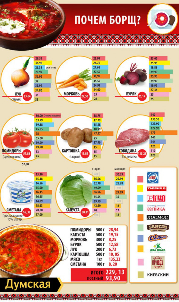 Борщевой рейтинг: за два года продукты для главного супа подорожали в полтора раза, а самый дорогой Космос (инфографика)После президентских выборов наиболее обсуждаемой темой в сети стали высокие цены на капусту и лук. Подорожание породило у нашей креативной нации целую кучу интернет-мемов, связанных с этим явлением: «Меняю капусту на квартиру в Киеве», Алло, отдел субсидий? «Мой сосед ест капусту с луком», «Була би Юля - була б дешевше цибуля». «Думская» обратилась к одесским аграриям, чтобы понять, кто виноват в этом «капустоциде». Кроме того, мы прошлись по самым крупным торговым сетям города и рынкам, узнали цены на борщевой набор и выяснили, как они изменились по сравнению с нашими предыдущими рейтингами. КАПУСТУ ВЕЗУТ ИЗ ЕГИПТА Наблюдаемый (и переживаемый) нами рост цен явно отличается от сезонных колебаний: «борщевая» инфляция превысила среднюю по стране аж в семь раз. Директор Украинской ассоциации поставщиков торговых сетей Алексей Дорошенко говорит, что мясной борщ подорожал на 16%, а вегетарианский – на 70% по сравнению с прошлым годом! Только за апрель этого года лук вырос в цене на 63,8%, капуста — на 52,8%, а морковь — на 30,1%. Ни с какими другими продуктами такого не происходило. Впрочем, вряд ли это следствие заговора рептилоидов, президента, правительства и депутатов. То, что овощи этой весной резко подскочат в цене, было ясно еще прошлым летом, говорит фермер из Балты Евгений Кифоренко. Всему виной, по его словам, — банальный неурожай. «Посевные площади в Украине из года в год одни и те же. Но в Херсоне в том году было мало осадков, а в Винницкой области – заморозки. В результате урожай лука и капусты был довольно маленьким. Такая же ситуация была с луком лет шесть-семь назад. А сейчас, весной, овощи закончились, и их пришлось экспортировать. Вот вам и результат», — говорит аграрий. По его словам, аналогичная ситуация сейчас сложилась и в Молдове, где, кроме лука и капусты, сильно подорожала картошка. Недостающие овощи везут, как правило, из Египта. Другие опрошенные нами эксперты убеждены, что рост цен связан и с сезоном праздников, на период которых продукты дорожают на 30-40%, но главным виновником все же является неурожай. ГДЕ ДЕШЕВЛЕ КУПИТЬ НА БОРЩ Мы выяснили, что по сравнению с 2015 годом наш борщ подорожал почти в три раза, а по сравнению с 2017-м — чуть больше чем в полтора. Правда, нужно сделать скидку на то, что рецепт борща у нас каждый раз немного менялся (сравнивались цены на одинаковые продукты в разных сетях), а в 2015 году мы делали обзор в августе, когда цены на овощи всегда самые низкие в году. Так, в нашей таблице за 2017 год капуста стоила 3,5 -5 гривен за килограмм, морковь — 5-7 гривен по сравнению с сегодняшней ценой в 25 -30 гривен. На мясо цены выросли не так сильно, а вот сметана сейчас стоит почти в полтора раза дороже. К счастью, на смену старому поколению капусты приходит молодая. В некоторых торговых сетях старой уже и вовсе нет. И на рынках сложно найти «золотокачанную», зато молодая продается за 17 -20 гривен. Вообще, в ценовой схватке продуктовые рынки с большим разрывом уступают розничным торговым сетям. В супермаркетах цены зачастую ниже из-за больших оборотов, там нередко бывают акции, за которыми можно следить в интернете. И если раньше можно было закупиться по дешевке у бабушек, которые часто обустраивают стихийные рынки 