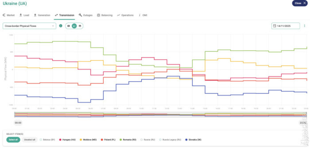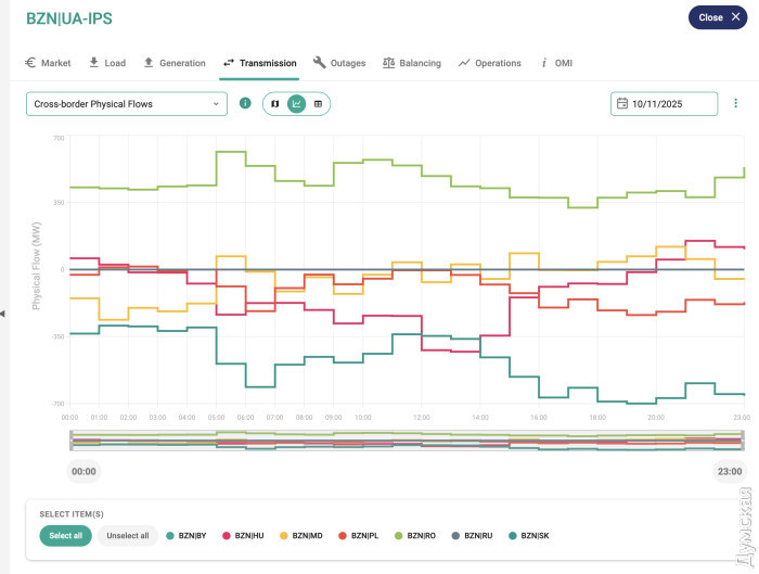 Росія б’є по інфраструктурі й запускає міфи про продаж світла за кордон: арифметика стабілізаційних відключень (колонка)Росія знову нищить українську енергетику. Однак разом з електростанціями, трансформаторами, та лініями передач вона атакує ще й в інформаційному просторі, намагаючись перекласти вину за свої злочини на українських енергетиків. Три роки тому я розповідав, де шукати інформацію про стан речей в енергетиці, і як маніпулюють цифрами та громадською думкою. Схоже, варто повторити це ще раз. Для початку — нагадаю певні моменти, які ви безсумнівно знаєте. Головною і найбільш стабільною частиною української електрогенерації залишається (тьху, тьху, тьху) ядерна генерація. Проте вона має свої особливості. По-перше, географія. Всі три українські АЕС, що працюють, Рівненська, Хмельницька та Південноукраїнська, знаходяться на Правобережжі. В інші області електрику треба передавати по магістральним ЛЕП через трансформатори, які зараз щоночі стають цілями для іскандерів та шахедів. Особливо гостро нестача пропускної спроможності відчувається у східних областях. Це одна з причин, чому на заході України світло є, а ближче до лінії фронту — значні проблеми. По-друге, маневровість. Атомні реактори мають працювати в більш-менш стабільному режимі. Їх не можна «вмикати зранку та вимикати ввечері» — для цього є теплові електростанції, які зараз теж під щільним ворожим вогнем. Як наслідок — якщо вночі електрики більш-менш вистачає, то вдень, коли споживання зростає, доводиться влаштовувати обмеження та черги на вимкнення. По-третє, балансування. Електрику не можна консервувати в промислових масштабах. Все, що виробляється, тобто генерується, треба одразу й спожити. Одного разу, у 2022 році, ворогу вдалося одночасною атакою по потужних трансформаторах відрізала станції від споживачів. Наслідок — автоматика безпеки заглушила реактори. Тоді кілька днів майже вся країна була без світла, тому що для повернення реактора до робочого режиму теж потрібен час. І наостанок. Україна приєднана до європейської енергомережі. Це дуже добре: можливість отримання додаткових потужностей від західних сусідів суттєво допомагала нам в скрутні моменти. Крім того, це дозволяє використовувати українську енергомережу для послуг транзиту: якщо, припустимо, Польща захоче продати електрику в Молдову, це можна зробити через українську мережу, звісно, з оплатою послуг. І ще одна важлива особливість обʼєднаної європейської енергомережі: вона абсолютно прозора. Всі дані про міждержавні потоки, їх напрямки та обсяги по всіх країнах доступна в режимі онлайн на сайті ENTSO-E. Тепер, коли ви знадали про ці особливості, подивимося на мисльовірус, який намагається вживити у наші голови ворог: «Відключення світла — це не тому, що росія стріляє, атому, що нашу електрику у нас крадуть і продають за кордон». В Одесі в таких випадках найчастіше показують кудись в бік Молдови. Таки речі легко можна перевірити на тому ж сайті ENTSO-E — тим більше там все подається там дуже наочно та зрозуміло. Можна, наприклад, дивитися графіки. Ось як виглядає транзит електрики зі Словаччини до Румунії через українські ЛЕП, який був 14 листопада 2025 року: Як бачите, ми обрали потоки через румунський (BZN | RO) та словацький (BZN | SK) кордони. На графіку дві смуги. Та, що нижче нуля — це приток, надходженн
