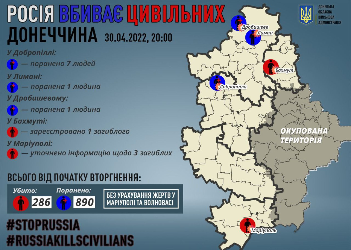 В результате вражеских обстрелов за сутки в Донецкой области погиб один мирный житель и девять пострадалиВ результате вражеских обстрелов 30 апреля пострадали девять жителей Донецкой области, один человек погиб. Как сообщил руководитель Донецкой ОВА Павел Кириленко, среди раненых – четыре ребенка: три в Доброполье и один в Дробышево. «Кроме того, в Бахмуте зарегистрирована смерть одного человека, раненого в Луганской области», — добавил Кириленко. Руководитель ОВА отметил, что в настоящее время удалось уточнить информацию о трех погибших в Мариуполе, но точное количество жертв в Мариуполе и Волновахе установить невозможно. СМЕРТЬ РОСІЙСЬКИМ ОКУПАНТАМ! Помітили помилку? Виділяйте слова з помилкою та натискайте control-enter |