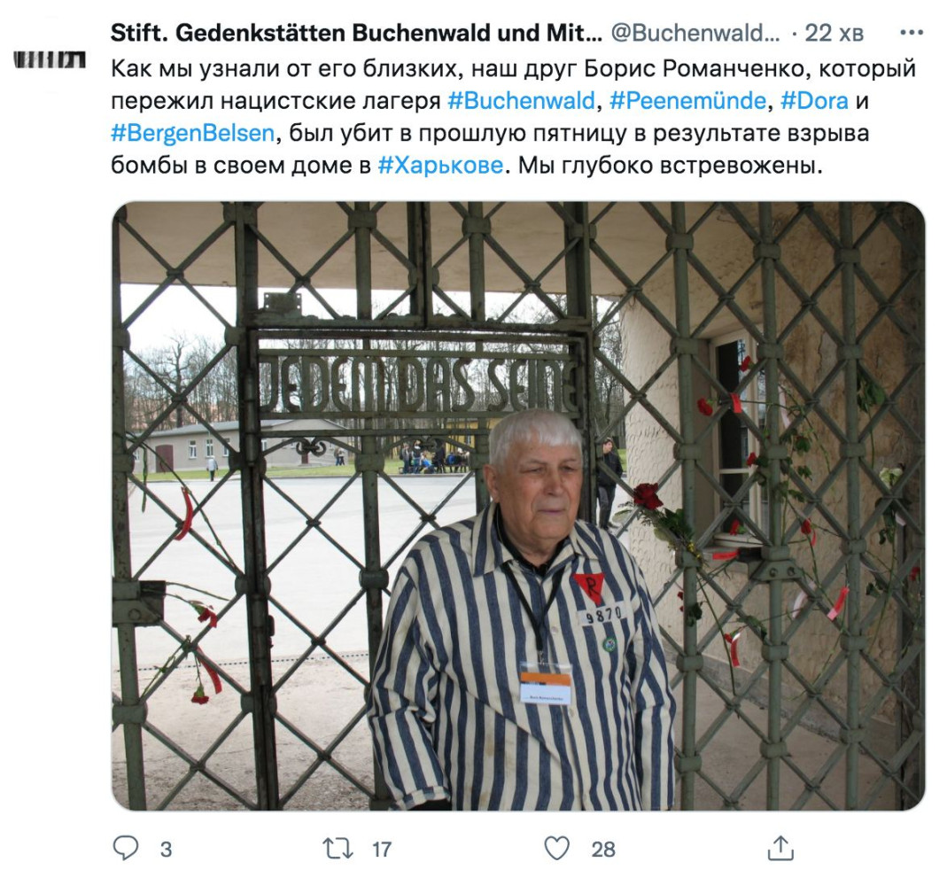 Бывший узник нескольких концентрационных лагерей Третьего Рейха Борис Романченко погиб в Харькове в результате попадания снаряда в жилой дом. Об этом сообщила администрация мемориального комплекса Бухенвальд, пишет «Европейская правда». «Как мы узнали от его близких, наш друг Борис Романченко, переживший нацистские лагеря Бухенвальд, Пенемюнде, Дора и Берген-Бельзен, был убит в прошлую пятницу в результате взрыва бомбы в своем доме в Харькове. По словам внучки, он жил в многоэтажном доме, в который попал снаряд», — говорится в сообщении. Борис Романченко, родившийся в 1926 году под Сумами, интенсивно работал над памятью о нацистских преступлениях и был вице-президентом Международного комитета Бухенвальд-Дора. В 2012 году Борис Романченко зачитал клятву Бухенвальда «Построение нового мира и свободы» во время празднования годовщины освобождения концлагеря Бухенвальд. СМЕРТЬ РОСІЙСЬКИМ ОКУПАНТАМ! Помітили помилку? Виділяйте слова з помилкою та натискайте control-enter |