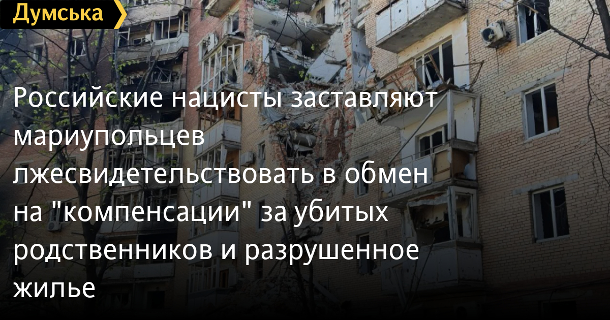 Российские нацисты заставляют мариупольцев лжесвидетельствовать в обмен на «компенсации» за убитых родственников и разрушенное жильеМасштабный подлог свидетельств жителей Мариуполя готовят российские нацисты. Как сообщает советник мэра Петр Андрющенко, оккупанты хотят получить письменные «показания» оставшихся в населенном пункте местных жителей о том, что их город якобы уничтожили украинские военные. Взамен российские нацисты предлагают «компенсации» за уничтоженное ими же жилье и/или потерю члена семьи (около 6 тыс. долларов за имущество и ориентировочно 33 тыс. долларов за убитого ими родственника). Регистрацию заявлений людей на «компенсацию» организовали в помещении школы №9. «При представлении собственноручно составленного письменного заявления мариупольцы должны обязательно отметить, что имущество «было уничтожено украинскими военными», а близкие «убиты украинской армией», — сообщает Андрющенко. В противном случае оккупанты сообщают, что деньги люди не получат. «В итоге россия получает десятки тысяч собственноручно составленных письменных «свидетельств» о «зверствах украинской армии». Которые должны использоваться для влияния на международное мнение, в том числе с широкой оглаской через пропагандистские медиа-каналы, продолжающие свою деятельность на территории стран ЕС», — уточнил советник мэра, который также выразил сомнение в способности рф выплатить людям в общей сложности около 2,5 млрд долларов. СМЕРТЬ РОССИЙСКИМ ОККУПАНТАМ! Заметили ошибку? Выделяйте слова с ошибкой и нажимайте control-enter |