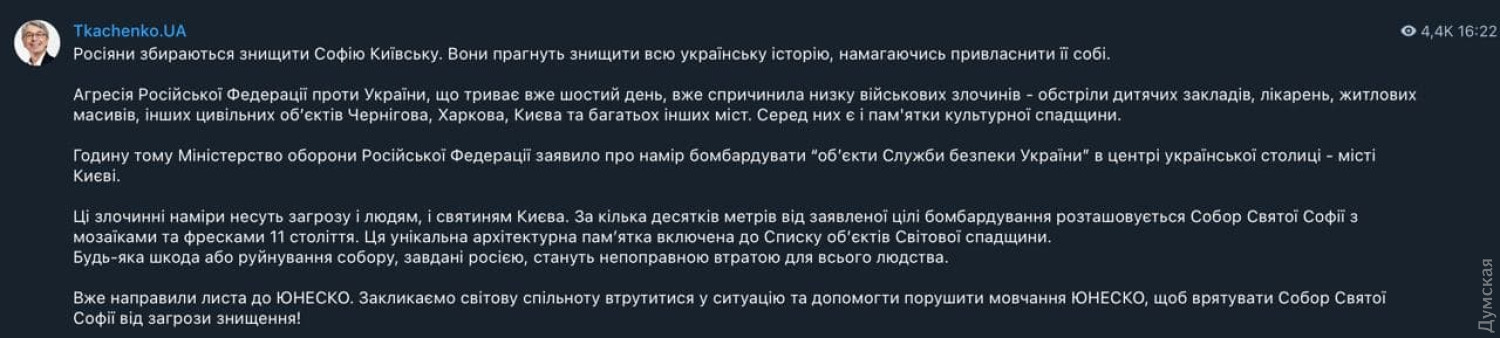 Российские оккупанты нанесли ракетный удар по мемориалу жертв Холокоста «Бабий Яр», попали в киевскую телевышку и нацелились уничтожить Софию Киевскую (обновлено)Российские оккупанты пытались уничтожить ракетными ударами мемориал жертвам Холокоста «Бабий Яр« в Киеве, где осенью 1943 года нацисты убили от 70 до 100 тысяч человек. Как сообщают столичные СМИ, нападение произошло примерно в 17:30. Вражеские ракеты повредили телевышку, расположенную рядом с мемориалом. Из-за попадания в аппаратную вещателя на телебашне возникли временные проблемы с телетрансляцией. Как сообщает ГСЧС, во время атаки оккупантов на телевышку погибли пятеро мирных жителей. Как сообщил министр культурной политики и информации Украины Александр Ткаченко, российские варвары грозятся уничтожить несколько инфраструктурных объектов в непосредственной близости от памятника ЮНЕСКО — собора Святой Софии. ОБНОВЛЕНО В 19:47. По состоянию на 18:00 в результате обстрела погибли пять человек. Еще пятеро получили ранения. Спасательные работы продолжаются, сообщают в ГСЧС Украины. СМЕРТЬ РОСІЙСЬКИМ ОКУПАНТАМ! Помітили помилку? Виділяйте слова з помилкою та натискайте control-enter |