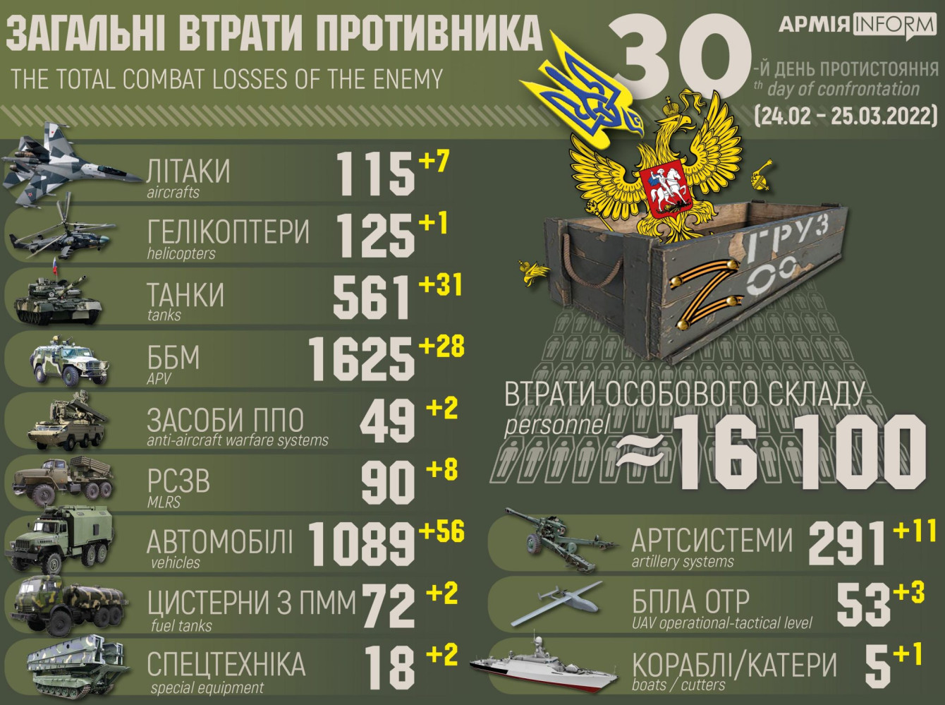 Российские оккупанты с начала войны потеряли свыше 16 тысяч человек и 115 самолетов (инфографика)Российские нацисты продолжают нести потери на территории Украины. Так, общие боевые потери противника с 24 февраля по 25 марта ориентировочно составили: личного состава — 16 100 человек; танков ‒ 561 единиц; боевых бронированных машин ‒ 1625 единиц; артиллерийских систем – 291 единица; РСЗО — 90 единиц; средства ПВО - 49 единиц; самолетов – 115 единиц; вертолетов – 125 единиц; автомобильной техники — 1089 единиц; корабли/катера — 5 единиц; цистерн с ГСМ - 72; БПЛА оперативно-тактического уровня – 53; специальная техника – 18. СМЕРТЬ РОСІЙСЬКИМ ОКУПАНТАМ! Помітили помилку? Виділяйте слова з помилкою та натискайте control-enter |