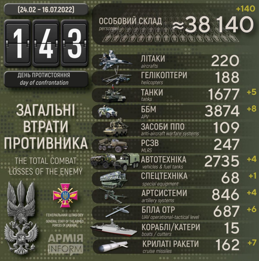 Російські окупанти за добу втратили 140 солдатів та офіцерів, п'ять танків та вісім бойових броньованих машин (інфографіка)140 человек личного состава, пять танков и восемь бронемашин потеряли за минувшие сутки российские оккупанты. Об этом сообщает Генштаб Вооруженных сил Украины. Также украинские защитники уничтожили четыре артсистемы, шесть БПЛА оперативно-тактического уровня, семь крылатых ракет, четыре единицы автомобильной техники и автоцистерн и одну единицу специальной техники. Наибольший урон врагу удалось нанести на бахмутском направлении. Всего с начала полномасштабной войны потери российских нацистов составили: 38140 человек, 1677 танков, 3874 ББМ, 846 артсистем, 247 РСЗО, 109 средств противовоздушной обороны, 220 самолетов, 188 вертолетов, 687 БПЛА, 162 крылатые ракеты, 15 кораблей и катеров, 2735 единиц автомобильной техники и автоцистерн, 68 единиц специальной техники. СМЕРТЬ РОСІЙСЬКИМ ОКУПАНТАМ! Помітили помилку? Виділяйте слова з помилкою та натискайте control-enter |