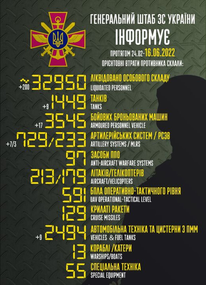 Российские оккупанты за сутки потеряли в Украине 200 человек, девять танков и семь артсистем200 солдат, девять танков и три РСЗО потеряли российские нацисты за минувшие сутки в Украине. Кроме того, как сообщает Генштаб Вооруженных сил, украинские защитники уничтожили 17 боевых бронированных машин, семь артиллерийских систем и девять единиц автомобильной техники. Всего с начала полномасштабного вторжения потери врага составили: личного состава — 32 950 человек; танков 1449 единиц; боевых бронированных машин 3545 единиц; артиллерийских систем – 729 единиц; РСЗО- 233 единицы; средства ПВО - 97 единиц; самолетов – 213 единиц; вертолетов – 179 единиц; БПЛА оперативно-тактического уровня – 591; крылатые ракеты — 129; корабли/катера — 13 единиц; автомобильной техники и автоцистерн — 2494 единицы; специальная техника – 55. СМЕРТЬ РОСІЙСЬКИМ ОКУПАНТАМ! Помітили помилку? Виділяйте слова з помилкою та натискайте control-enter |