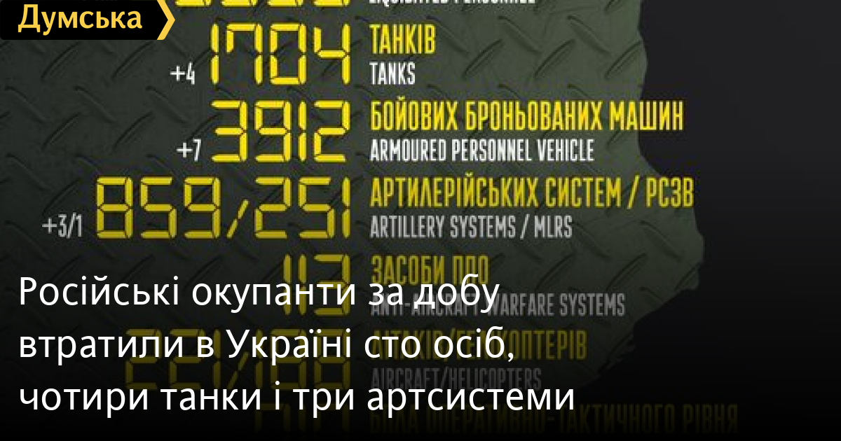 Російські окупанти за добу втратили в Україні сто осіб, чотири танки і три артсистемиСто осіб, чотири танки і три артсистеми втратили окупанти за минулу добу в Україні. Крім того, за даними Генерального штабу Збройних сил, українські захисники також знищили сім бойових броньованих машин, одну РСЗВ, сім БПЛА оперативно-тактичного рівня, шість одиниць автомобільної техніки і дві одиниці спецтехніки. Всього з початку повномасштабного вторгнення втрати ворога склали: особового складу — 38 850 осіб; танків ‒ 1704 одиниці; бойових броньованих машин ‒ 3912 одиниць; артилерійських систем — 859 одиниць; РСЗВ — 251 одиницю; засоби ППО - 113 одиниць; літаків – 221 одиницю; гелікоптерів – 188 одиниць; БПЛА оперативно-тактичного рівня — 710; крилаті ракети — 167; кораблі /катери — 15 одиниць; автомобільної техніки та автоцистерн — 2781 одиницю; спеціальна техніка — 72. СМЕРТЬ РОСІЙСЬКИМ ОКУПАНТАМ! Помітили помилку? Виділяйте слова з помилкою та натискайте control-enter |