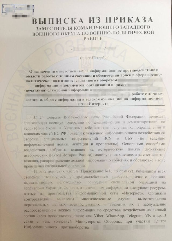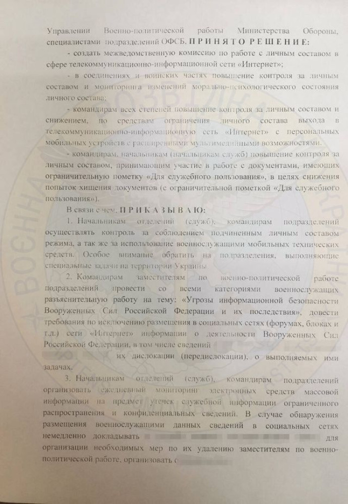 Российским оккупантам могут запретить пользоваться Интернетом: командование считает, что они слишком подвержены влиянию украинских информресурсовОккупанты признали провал на информационном фронте и усиливают цензуру в армии. Вплоть до ограничения общения через мессенджеры. Об этом свидетельствует документ, обнародованный Главным управлением разведки Министерства обороны Украины. Российское командование жалуется, что украинские военные и спецслужбы слишком сильно влияют на оккупантов. Речь идет об информационной войне, агитации и пропаганде. Об этом говорится в «Выписке по приказу заместителя командующего западным военным округом по военно-политической работе», которую разослали в военные части. «Командиры всех степеней столкнулись с противодействием личного состава», который выражает недовольство войной в Украине, говорится в документе. А виноваты во всем, мол, Интернет и популярные мессенджеры. Основные способы влияния: «воздействие на историческую память (искажение исторических фактов истории россии), манипулирование мнениями за счет агентов влияния». А также распространение неправдивой, по мнению оккупантов, информации о событиях и обстановке в зоне боевых действий, свидетельствует обнародованный ГУР документ. Чтобы этому противодействовать, оккупантам просто ограничат доступ к интернету. По мнению российских нацистов, именно использование современных технологий приводит к учащению краж документов «Для служебного пользования». Следовательно, бороться с этим явлением можно только повысив уровень контроля за доступом к информации и общением в мессенджерах. Так что российским военным либо запретят вовсе, либо будут подвергать жесткой цензуре все сообщения и любую информацию, размещенную в «телекоммуникационно-информационной сети Интернет». Сам факт появления подобного документа свидетельствует о эффективности украинских информационных войск в противодействии агитации оккупантов. СМЕРТЬ РОСІЙСЬКИМ ОКУПАНТАМ! Помітили помилку? Виділяйте слова з помилкою та натискайте control-enter |