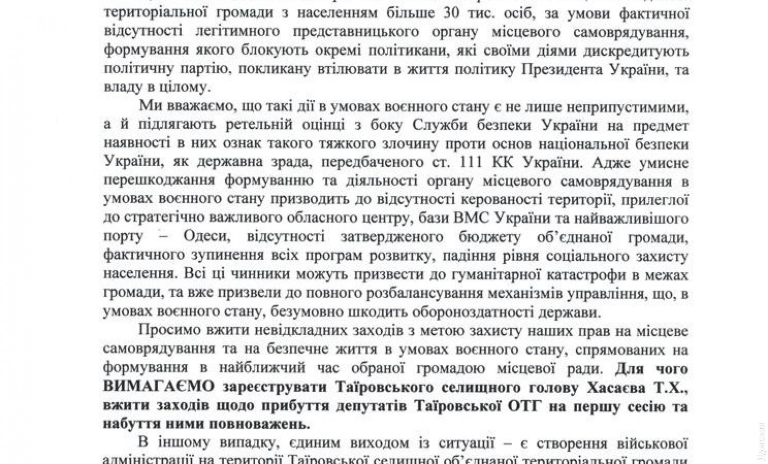 Руководители одесской «Батькивщины» сфальсифицировали подписи под обращением к президенту?В сети сейчас распространяется письмо жителей Таировской поселковой объединенной громады Овидиопольского района Одесской области к президенту Украины, секретарю СНБО, главе СБУ, главе Одесской ОДА и начальнику УСБУ региона с просьбой «отреагировать на фактическое безвластие в громаде, которое может привести к тяжелым последствиям во время военного положения». В нем отмечается, что с декабря прошлого года в ОТГ воцарилось фактически безвластие: нет председателя, а избранный совет никак не может собраться. Из-за этого якобы могут произойти всякие ужасы, вплоть до вторжения рептилоидов. Под письмом стоят подписи трех сотен жителей Таирово. Однако, как сообщают местные, по поводу части автографов есть серьезные сомнения. Скажем, на первом листе под №3 стоит подпись директора таировской школы Аллы Загороднюк. Она скончалась в августе этого года. С десяток человек (это только те, кого опросили!) вообще не знают о таком документе. Говорят, что последний раз расписывались под обращением о строительстве школы и детского сада для «Радужного». Один из подписантов с сентября лежит в тяжелом состоянии в больнице и что-либо подписывать не может физически. «И таких там очень много. Это очень грубая фальсификация», — говорит один из наших собеседников. Письмо составляли одесские функционеры «Батькивщины»: эта политическая сила борется за власть в ОТГ. СМЕРТЬ РОСІЙСЬКИМ ОКУПАНТАМ! Помітили помилку? Виділяйте слова з помилкою та натискайте control-enter |