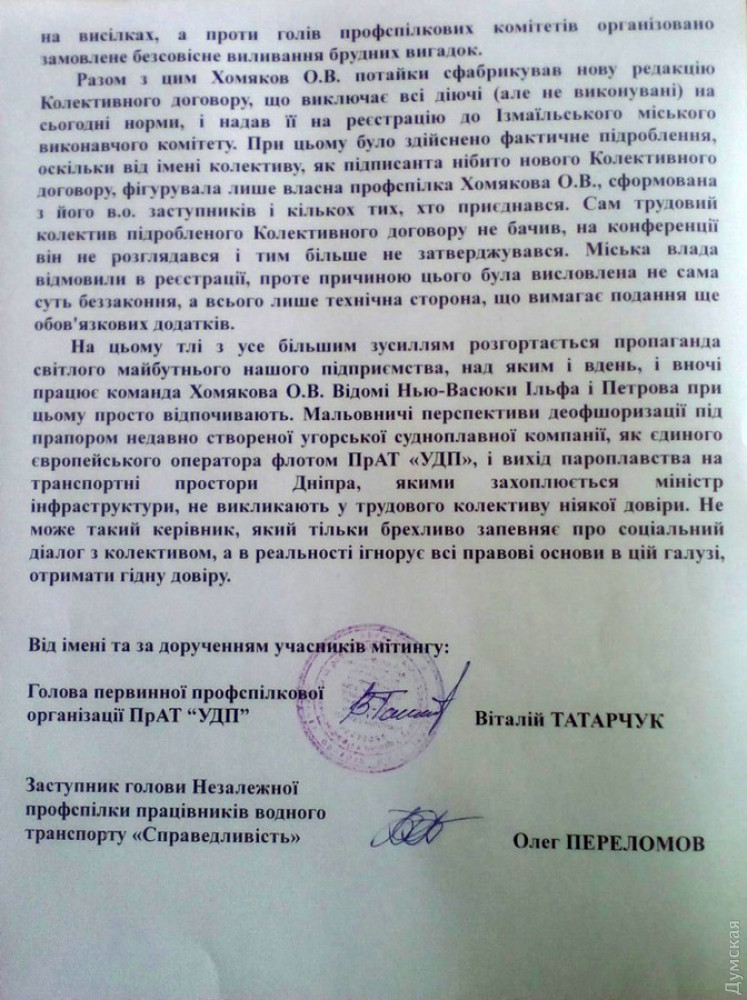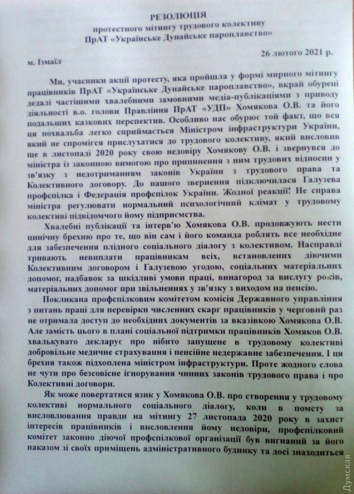 Во время последнего митинга 26 февраля собравшиеся приняли решение направить обращение в Верховную Раду и к премьер-министру Украины. К министру инфраструктуры Владиславу Криклию решили не обращаться, поскольку доверия к нему у людей уже нет. Дело в том, что после предыдущей акции протеста в конце ноября прошлого года ему было направлено обращение, но результата никакого не последовало. У коллектива сложилось мнение, что откровенно коррупционная схема по выводу украинского флота за границу приводилась в исполнение не без поддержки нынешнего руководителя Минифраструктуры.