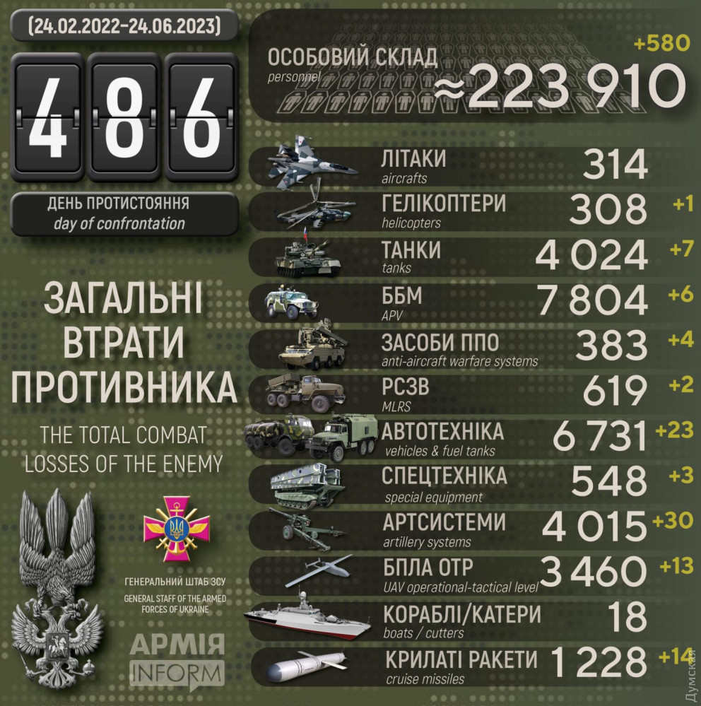 З початку великої війни Сили оборони знищили понад чотири тисячі ворожих танків і стільки ж артсистем, зокрема 30 пушок лише за добуЧотири тисячі ворожих танків і стільки ж артсистем втратили окупанти в Україні протягом останніх 16 місяців. А от за останню добу, за даними Генерального штабу Збройних сил України, наші захисники знищили 580 військових рф, гелікоптер, 30 пушок, 7 танків, 6 бойових броньованих машин, дві РСЗВ, 4 засоби ППО, 13 дронів оперативно-тактичного рівня, 14 крилатих ракет, 23 одиниці автомобільної техніки та 3 - спецтехніки. Усього з початку повномасштабного вторгнення втрати ворога склали: особового складу ‒ 223910 (+580) осіб ліквідовано танків ‒ 4024 (+7) бойових броньованих машин ‒ 7804 (+6) артилерійських систем ‒ 4015 (+30) РСЗВ ‒ 619 (+2) засоби ППО ‒ 383 (+4) літаків ‒ 314 (0) гелікоптерів ‒ 308 (+1) БПЛА оперативно-тактичного рівня ‒ 3460 (+13) крилаті ракети ‒ 1228 (+14) кораблі / катери ‒ 18 (0) автомобільної техніки та автоцистерн ‒ 6731 (+23) спеціальна техніка ‒ 548 (+3) СМЕРТЬ РОСІЙСЬКИМ ОКУПАНТАМ! Помітили помилку? Виділяйте слова з помилкою та натискайте control-enter |